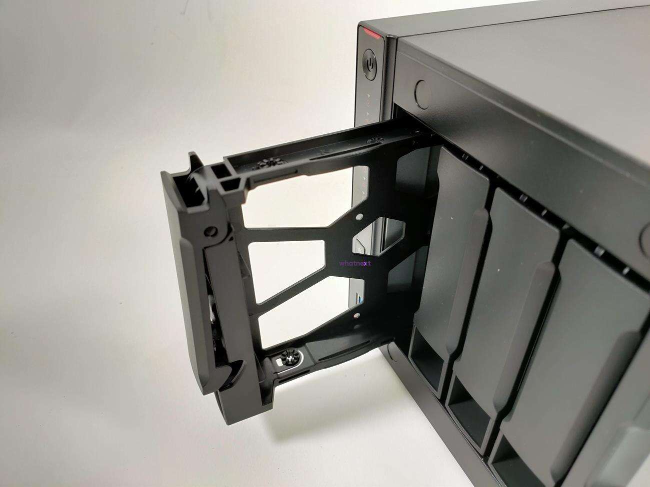 Za metalową zasłonką mocowaną na magnesy znajdują się miejsca na dyski. Asustor Nimbustor 4 AS5304 zmieści cztery dyski 2,5/3,5 cala o maksymalnej pojemności 64 TB. Odpowiednie śrubki służące do montażu są dołączone do serwera, a sam montaż jest naprawdę prosty.