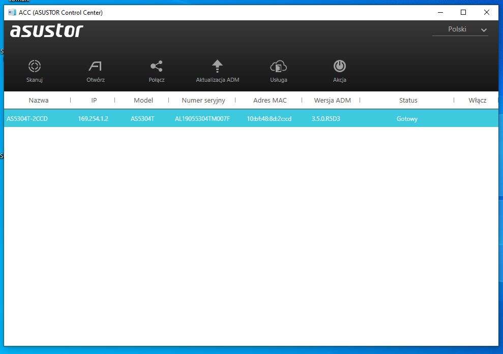 Asustor Nimbustor 4 AS5304 można łatwo znaleźć poprzez program Asustor Control Center. Tam też łatwo zmapujecie dysk, jeśli istnieje taka potrzeba czy zaktualizujecie oprogramowanie.