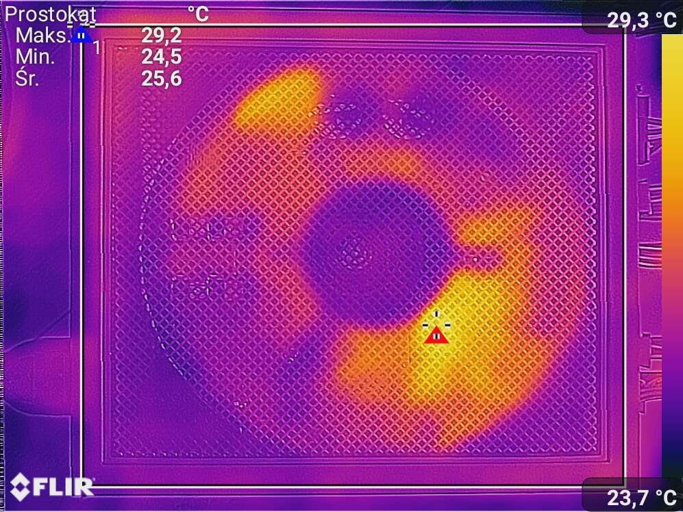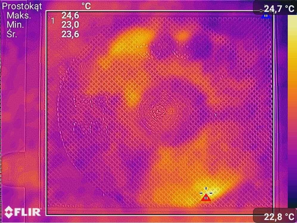 Spoczynek polegał tylko na wyświetlaniu pulpitu. Obciążenie to FurMark + Cinebench R23. W testach temperatury wykorzystałem moduł termowizyjny smartfonu CAT S61.