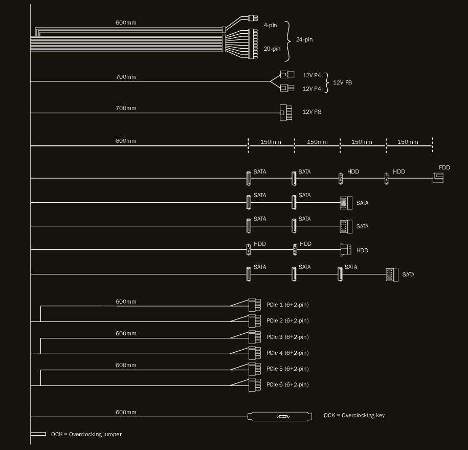 Okablowanie jest w pełni modularne. Poniższy screen chyba najlepiej przedstawia dostępne przewody oraz ich długość.
