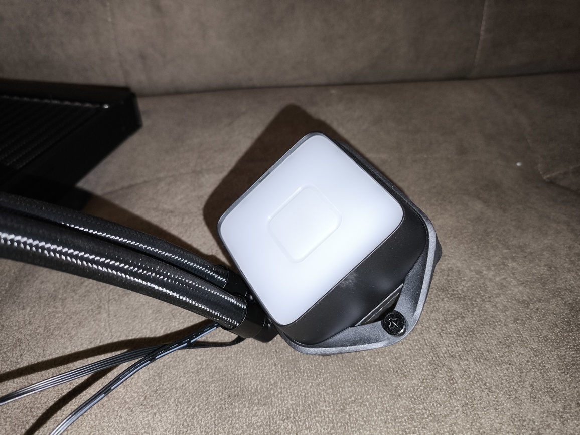 Pompkę zamknięto w obudowie wykonanej z matowego tworzywa sztucznego, o wymiarach około 60 × 60 × 30 mm. Konstrukcja ma regularny, kwadratowy kształt z delikatnie zaokrąglonymi krawędziami, co nadaje jej nowoczesny i stonowany wygląd. Na górnej części bloku wodnego umieszczono podświetlenie ARGB, które stanowi główny element wizualny zestawu.