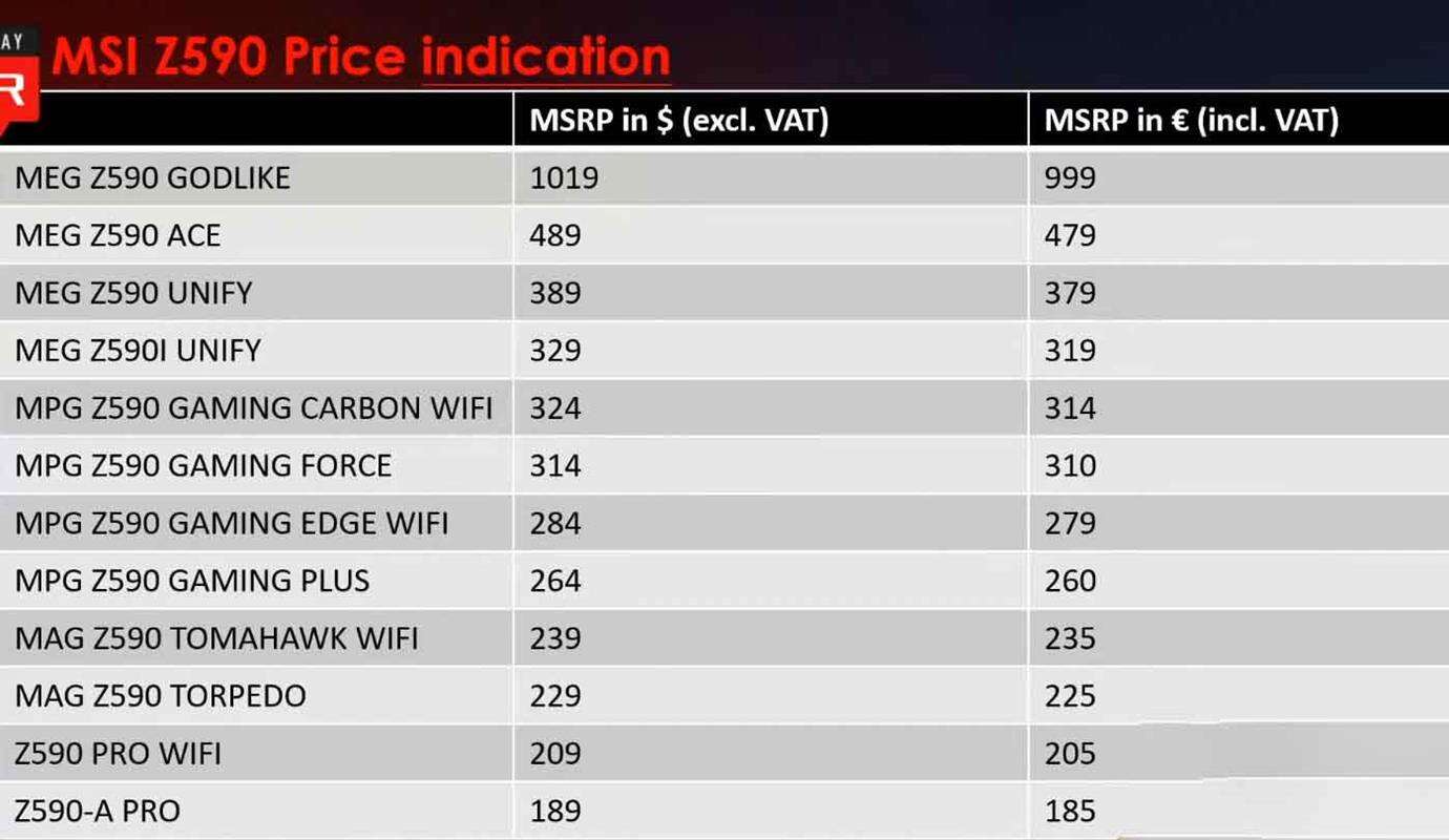 Na pierwszy ogień weźmy modele MSI, których jest aż dwanaście w cenie od 185 do niebywałych 999 euro (640-4500 zł) z wliczonym podatkiem VAT. Tą najdroższą konstrukcją jest płyta MEG Z590 Godlike