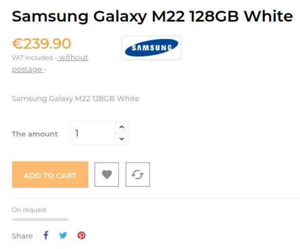 Europejski sprzedawca niespodziewanie i bez powodu ujawnił nam przedpremierowo cenę smartfonu Galaxy M22, która za wariant 4/128 GB pamięci w tym „wycieku” wyniesie (wliczając VAT) 239,90 euro ~ około 1080 złotych.