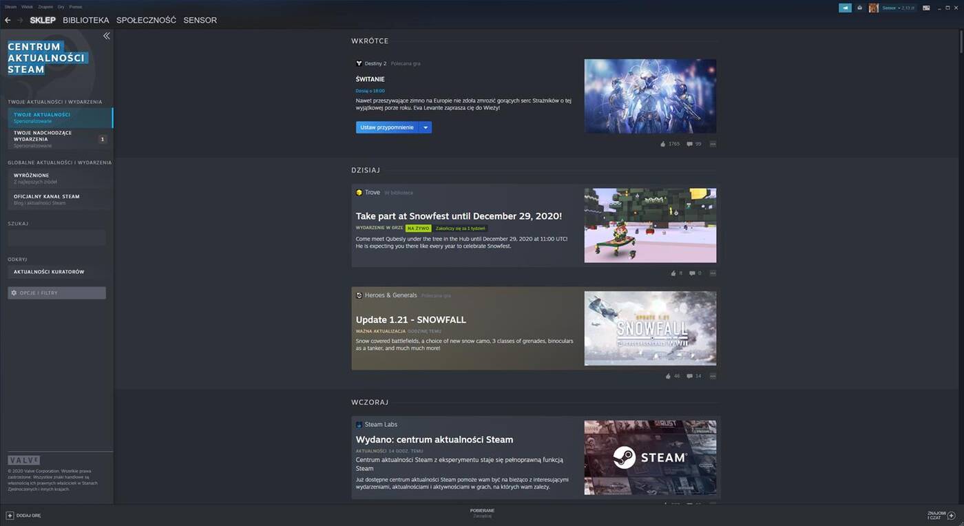 Centrum Aktualności Steam znajdziecie w zakładce Sklepu na głównym pasku, gdzie w języku polskim jest oznaczone mianem „Aktualności”. Domyślnie znajdziemy tam wiadomości od twórców gier, w które gramy, obserwujemy, czy posiadamy na liście życzeń, ale nic nie przeszkadza w tym, żeby dodać do swojego feedu interesujących nas kuratorów.