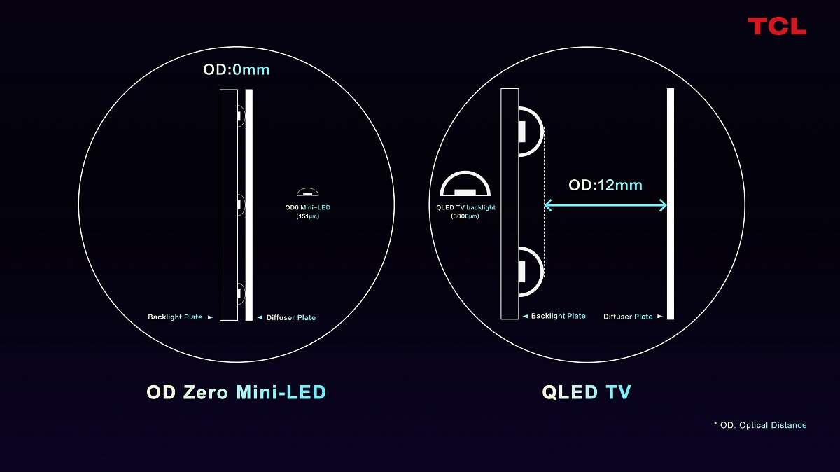 TCL zaprezentowało też nowatorską technologię OD ZeroTM Mini-LED. TCL wdrożyło najnowszą technologię podświetlenia Mini-LED do ultrapłaskich telewizorów LCD LED, co pozwoliło na osiągnięcie niemożliwego wcześniej, ultracienkiego ekranu. Do tego technologia ta zapewnia bogatsze kolory, precyzyjny kontrast i płynną jednorodność wyświetlanego obrazu. Ultracienki moduł podświetlania został osiągnięty dzięki redukcji odległości pomiędzy warstwą podświetlania Mini-LED i warstwą rozpraszającą wyświetlacza LCD. Wynosi ona teraz 0mm.