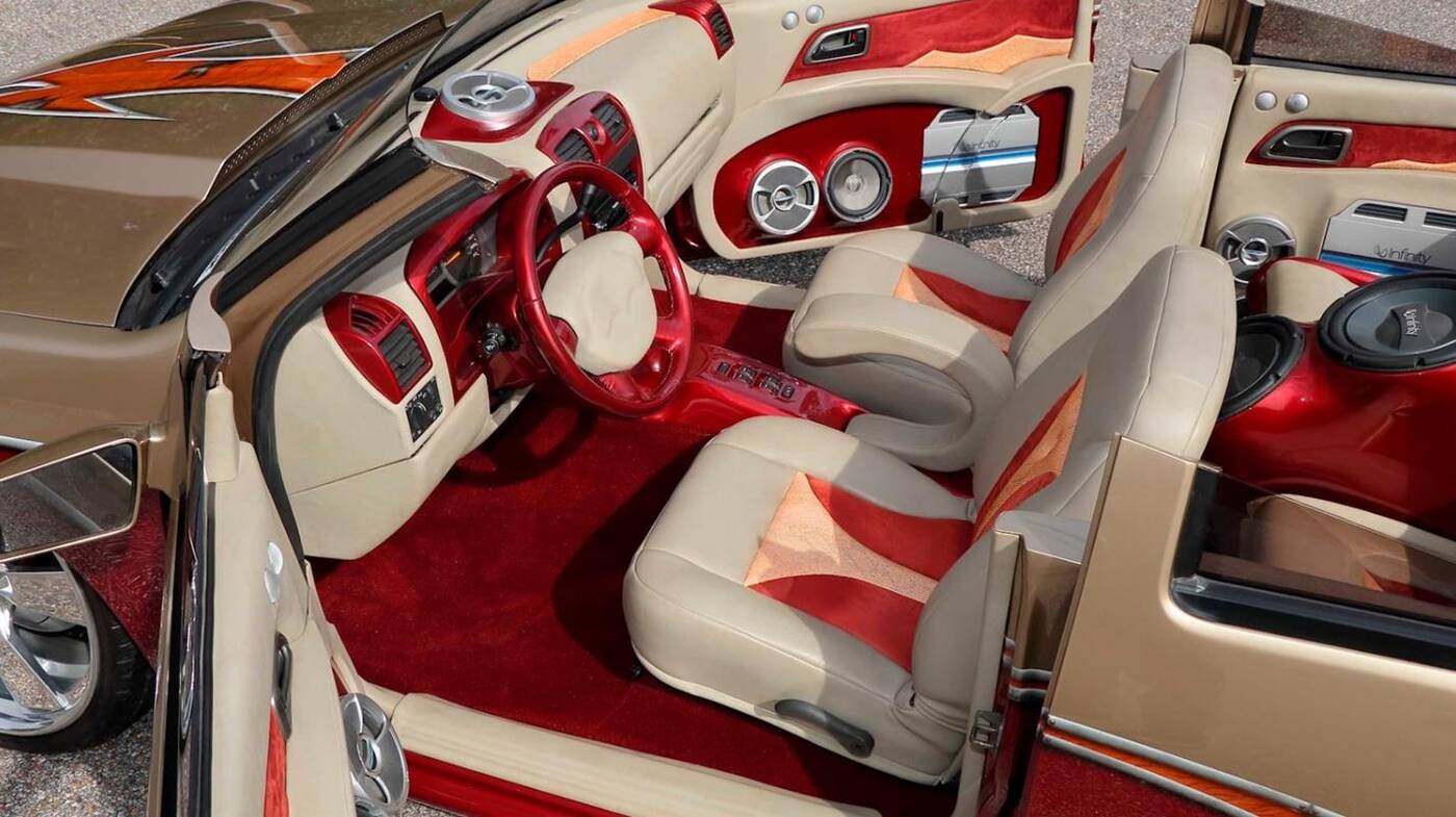 Kabina jest jednak tym, co może zachwycić, jako że uderza w scenę tuningową sprzed dwóch, a może nawet i trzech dekad. utrzymane w kolorystyce bordowej i beżowo-brązowej, nadaje samochodowi wyjątkowy charakter, którego podkreślają wstawki z wężowej skóry i gruby dywan na podłodze.