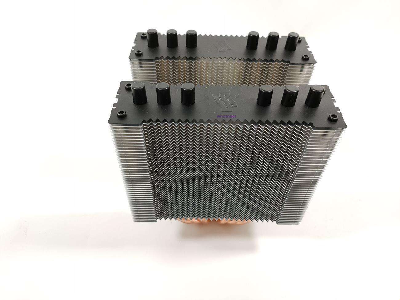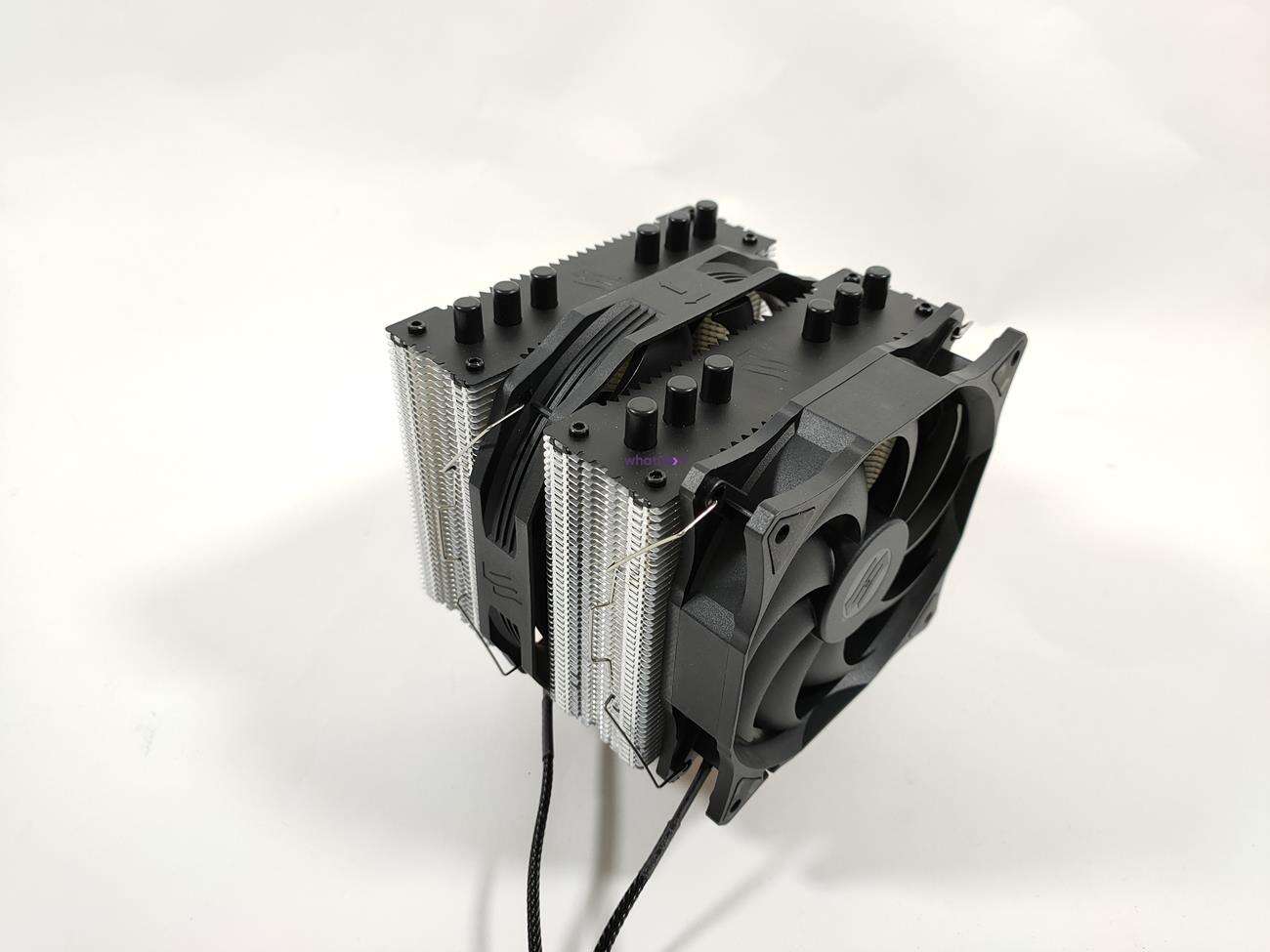 Chłodzenie jest typu dual tower. Jego dokładne wymiary to 159 x 140 x 131 mm i waży ono 985 g. Podstawka jest miedziana i wychodzi z niej sześć 6 mm ciepłowodów. Całość jest w stanie poradzić sobie z procesorem o TDP do 250 W. Jakość wykonania jest dobra jak na swoją cenę – nie zauważyłem jakiś większych niedoróbek czy braków.