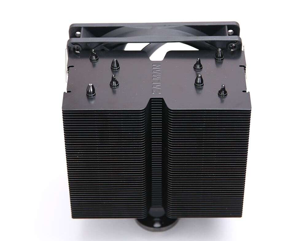 Zalman CNPS10X Performa Black mierzy 165 x 140 x 170 mm i może pochwalić się wagą 860 gramów, na które składa się przede wszystkim masywny aluminiowy radiator z horyzontalnie ułożonymi finami. Te przejmują całe ciepło z czterech miedzianych ciepłowodów o średnicy 6 mm, które rozciągają się wzdłuż całej konstrukcji, dotykając bezpośrednio odpromiennika ciepła procesora, czyli IHSa.