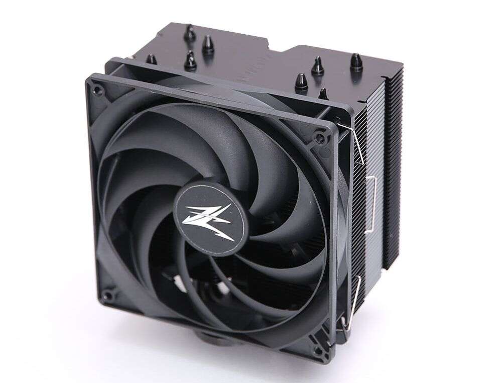 Z samych finów ciepło rozprasza pojedynczy 135 mm wentylator turbinowy z łożyskowaniem EBR, który kręcąc się w zakresie od 700 do 1500 RPMgeneruje nie więcej, niż 28 dBA hałasu, mogąc pochwalić się żywotnością szacowną na około 50000 godzin i zdolnością do przepchnięcia prawie 130 metrów sześciennych powietrza w ciągu godziny.