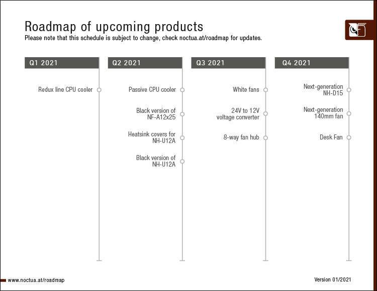 Takie produkty jak pasywne chłodzenie, czarne wentylatory NF-A12x25 czy czarne chłodzenia NH-U12A zostały przesunięte na drugi kwartał 2021 roku. Białe wentylatory pojawią się w trzecim kwartale 2021 roku.
