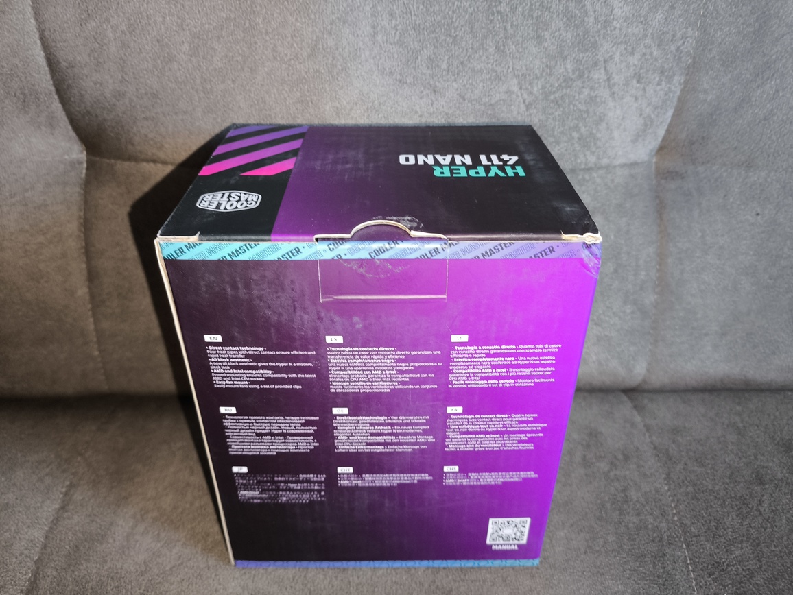 Opakowanie chłodzenia Cooler Master Hyper 411 Nano utrzymane jest w charakterystycznym dla tej marki stylu wizualnym, opartym na intensywnych przejściach kolorystycznych w odcieniach fioletu, niebieskiego i różu. Górną część frontu zajmuje pas z powtarzającym się diagonalnie logotypem producenta, poniżej którego umieszczono centralnie dużą grafikę samego chłodzenia. Po bokach i w dolnych partiach opakowania pojawiają się dodatkowe, geometryczne wzory w formie ukośnych pasów oraz akcentów kolorystycznych, nadające całości wyraźnie dynamiczny, nowoczesny charakter.