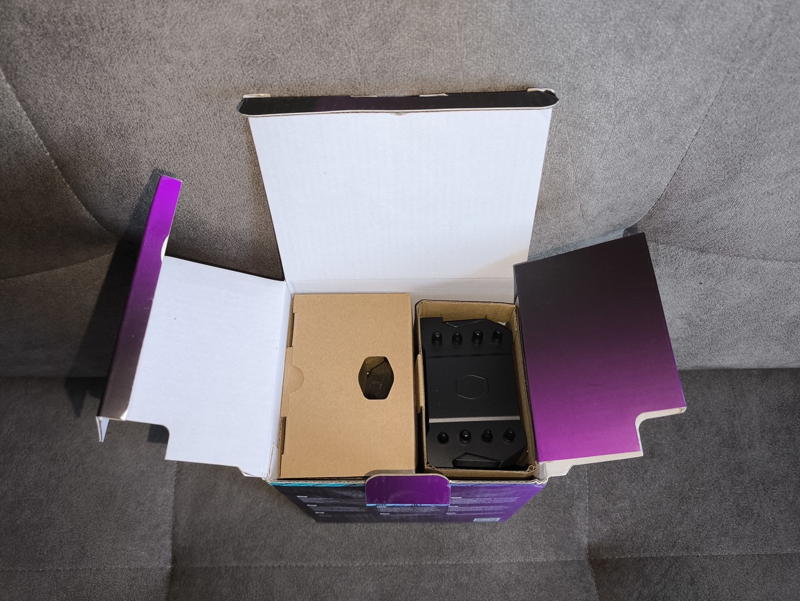 Nazwa modelu znajduje się w lewym dolnym rogu, natomiast po prawej stronie umieszczono kolejne logo Cooler Master. Całość wizualnie wyróżnia się na tle typowych, stonowanych opakowań chłodzeń i sprawia wrażenie produktu kierowanego do użytkowników, którzy zwracają uwagę nie tylko na parametry techniczne, ale również na stronę estetyczną.