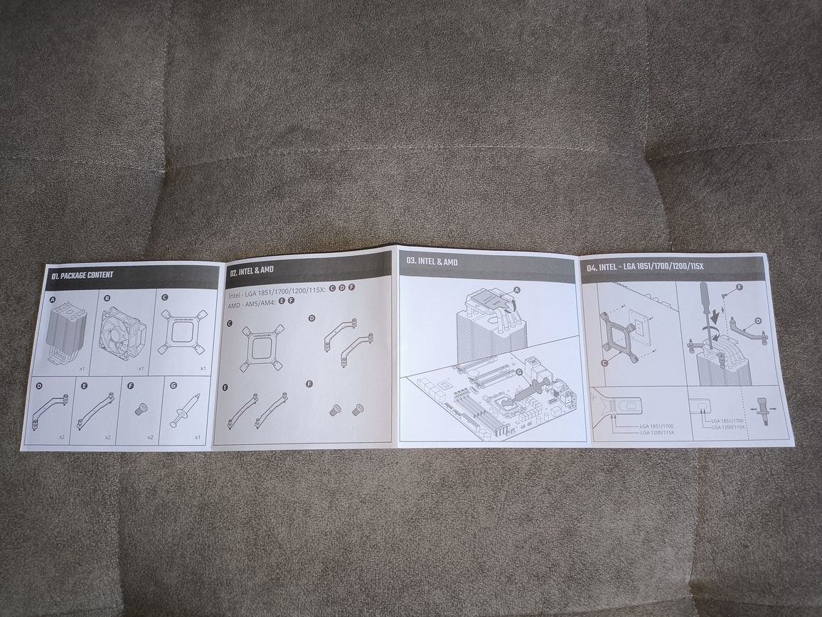 Po otwarciu pudełka na wierzchu znajduje się komplet dokumentacji, w tym instrukcja montażu oraz karta gwarancyjna. Wnętrze zostało podzielone na dwie oddzielne sekcje kartonowe. W jednej z nich umieszczono sam radiator, natomiast w drugiej znalazł się wentylator oraz zestaw elementów montażowych, oddzielonych dodatkową przekładką. W zestawie producent dołącza również niewielką tubkę pasty termoprzewodzącej.