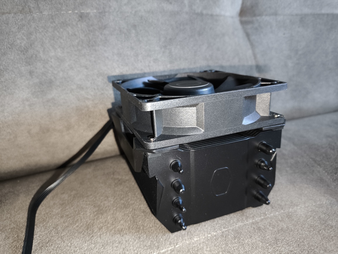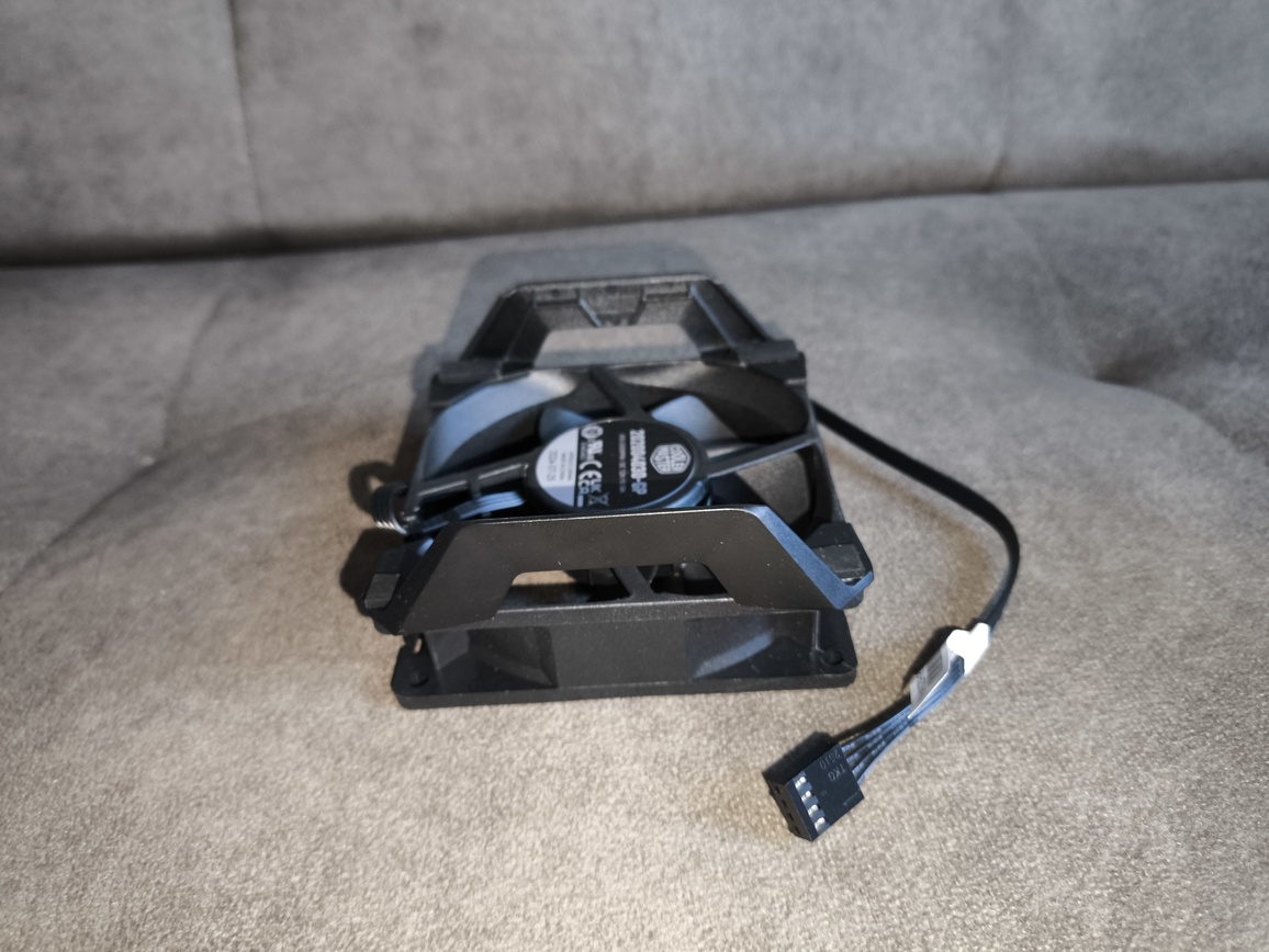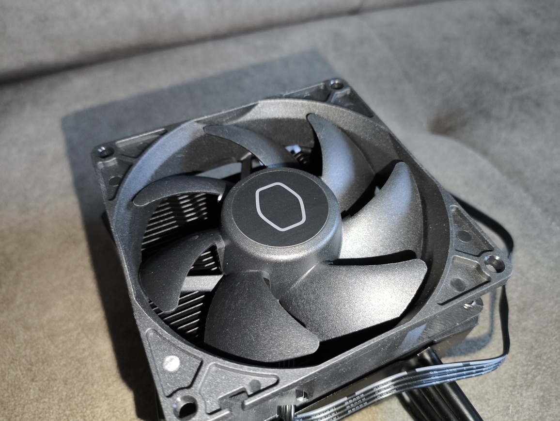 Zastosowany wentylator to autorska jednostka Cooler Master, niedostępna w sprzedaży detalicznej. Pod względem wizualnym przypomina serię SickleFlow Edge, szczególnie w kontekście kształtu łopatek. Jest to 92-milimetrowy wentylator PWM z siedmioma łopatkami, oferujący maksymalny przepływ powietrza na poziomie 45.14 CFM oraz ciśnienie statyczne rzędu 3,25 mmH₂O.