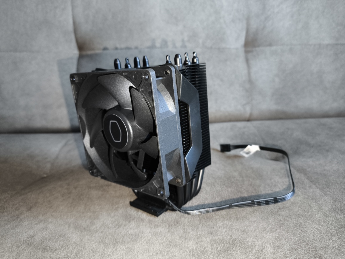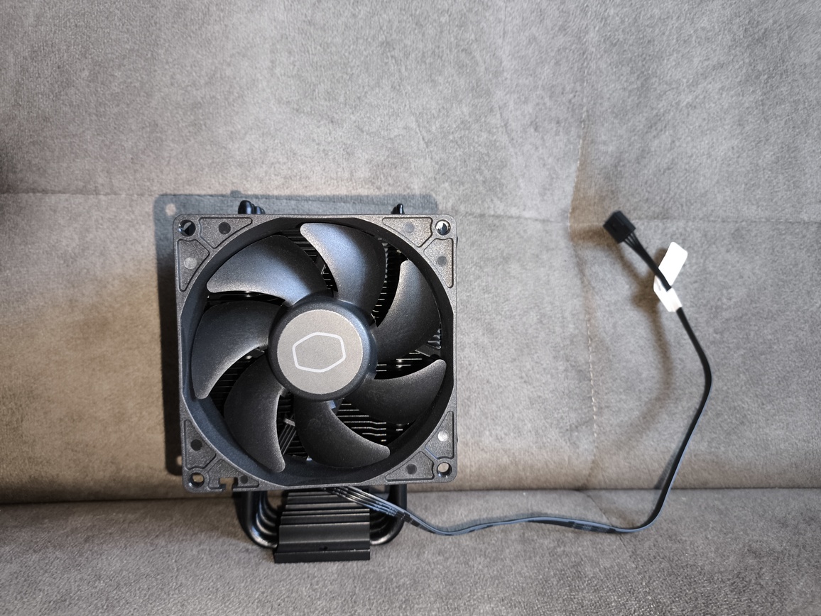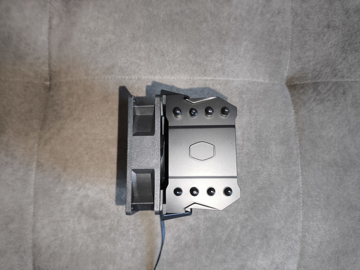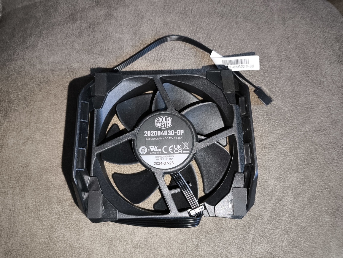 Zastosowany wentylator to autorska jednostka Cooler Master, niedostępna w sprzedaży detalicznej. Pod względem wizualnym przypomina serię SickleFlow Edge, szczególnie w kontekście kształtu łopatek. Jest to 92-milimetrowy wentylator PWM z siedmioma łopatkami, oferujący maksymalny przepływ powietrza na poziomie 45.14 CFM oraz ciśnienie statyczne rzędu 3,25 mmH₂O.