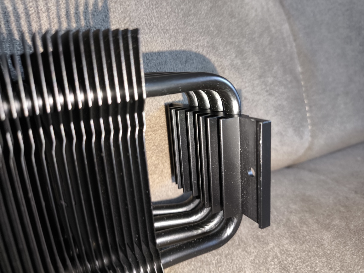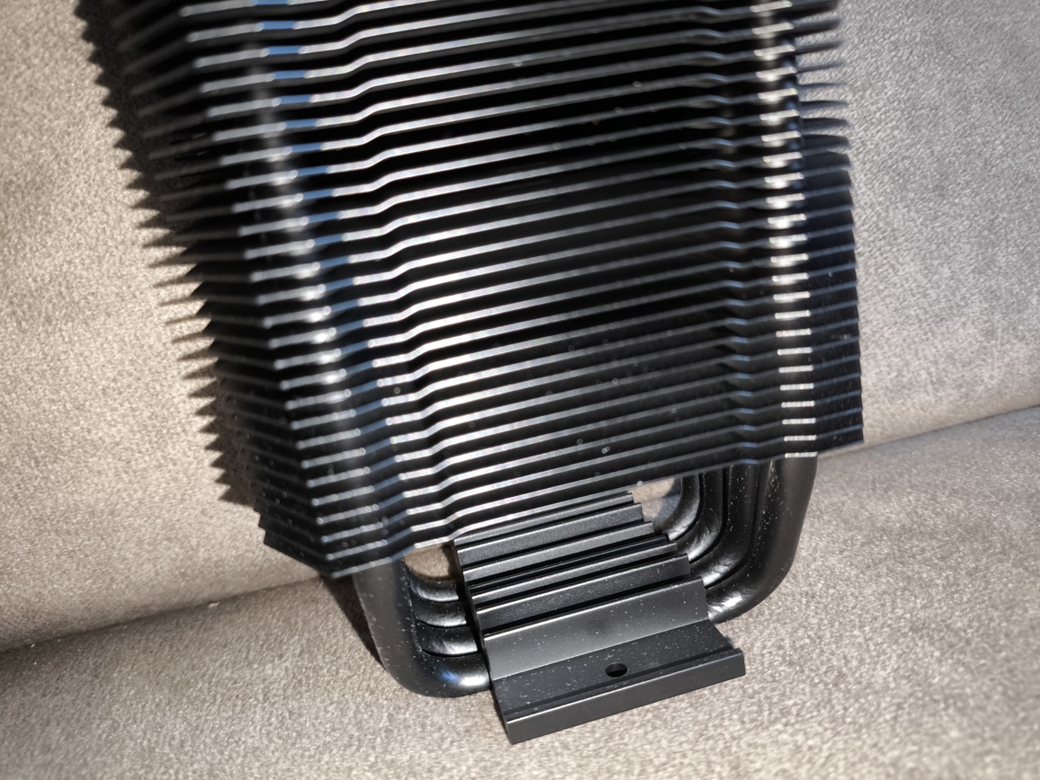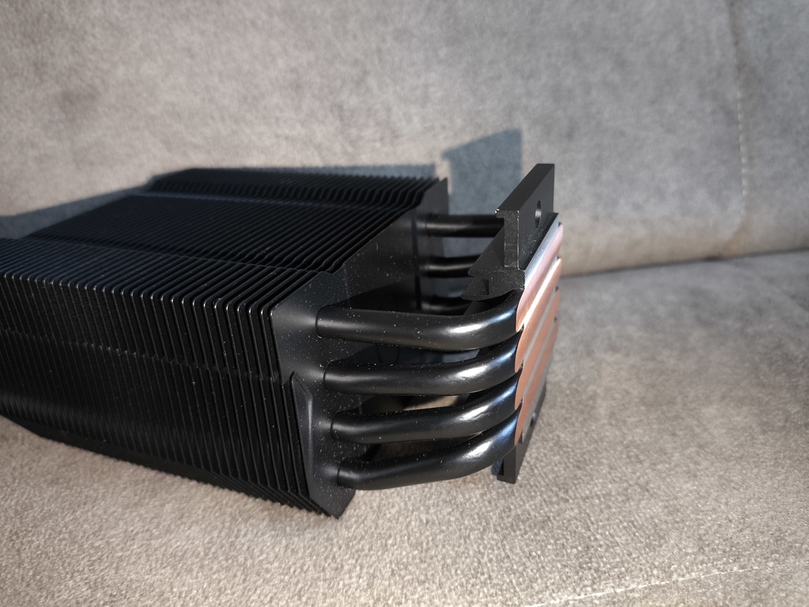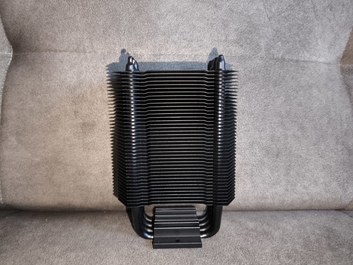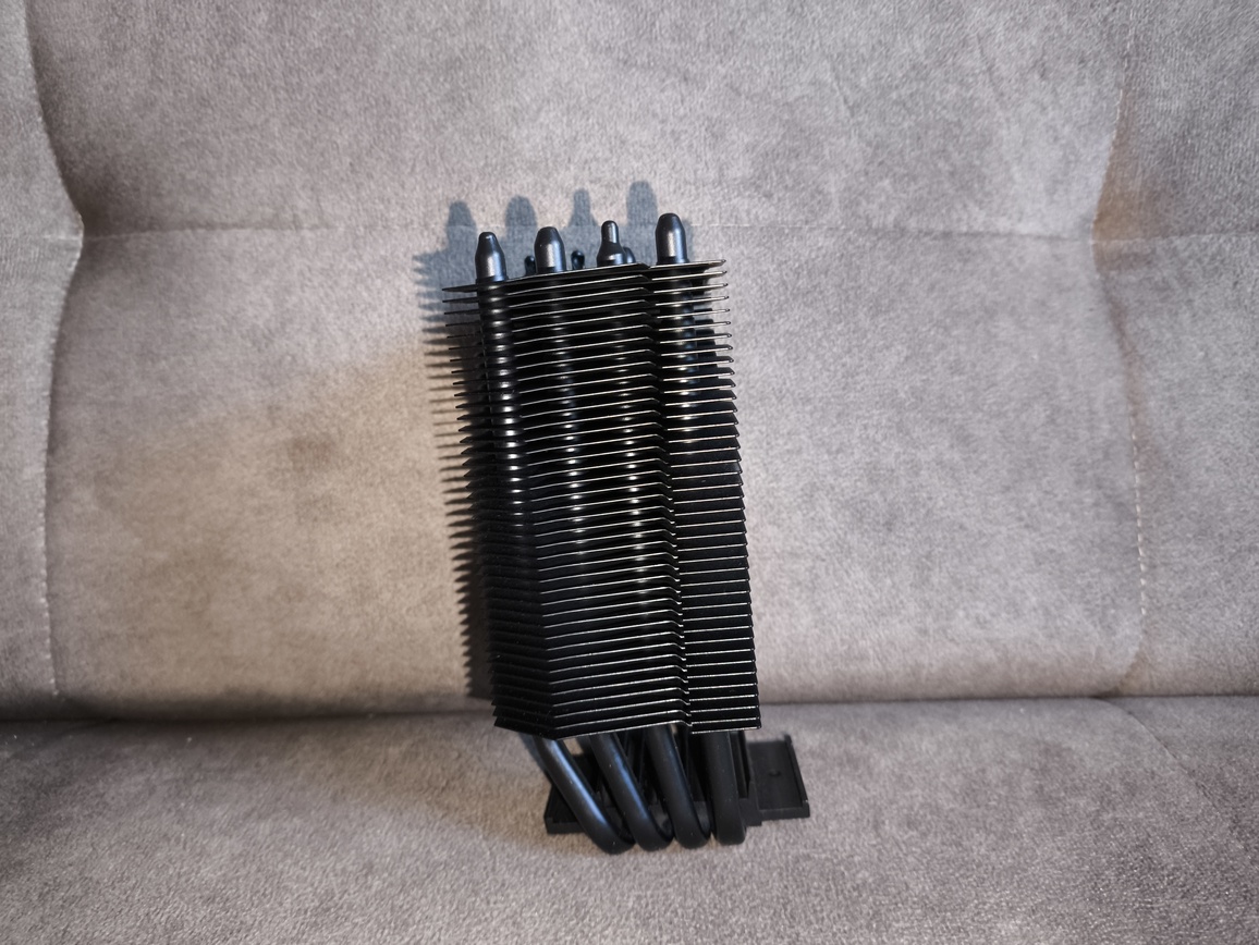 Radiator składa się z około czterdziestu aluminiowych finów, rozstawionych w odstępach bliskich 2 mm, z niewielkimi, produkcyjnymi odchyleniami. Przez całą strukturę przechodzą cztery rurki cieplne wygięte w kształt litery „U”, co w praktyce daje osiem punktów styku z żeberkami. Taka konfiguracja zapewnia równomierne rozprowadzanie energii cieplnej po całej powierzchni radiatora.