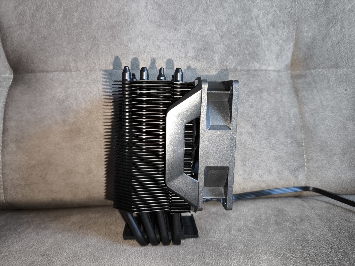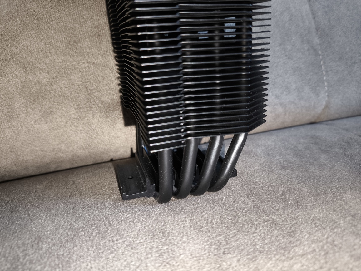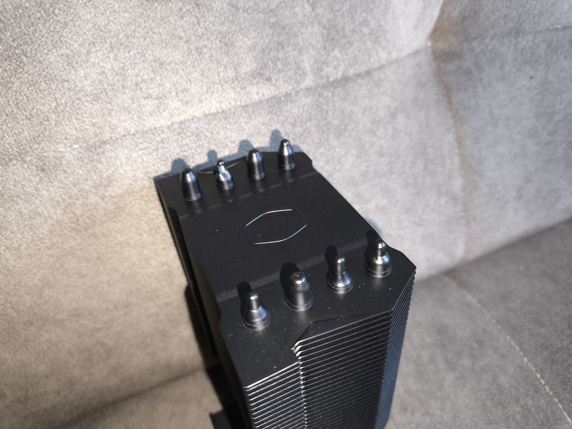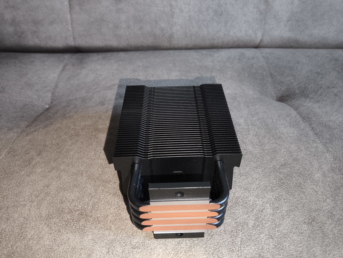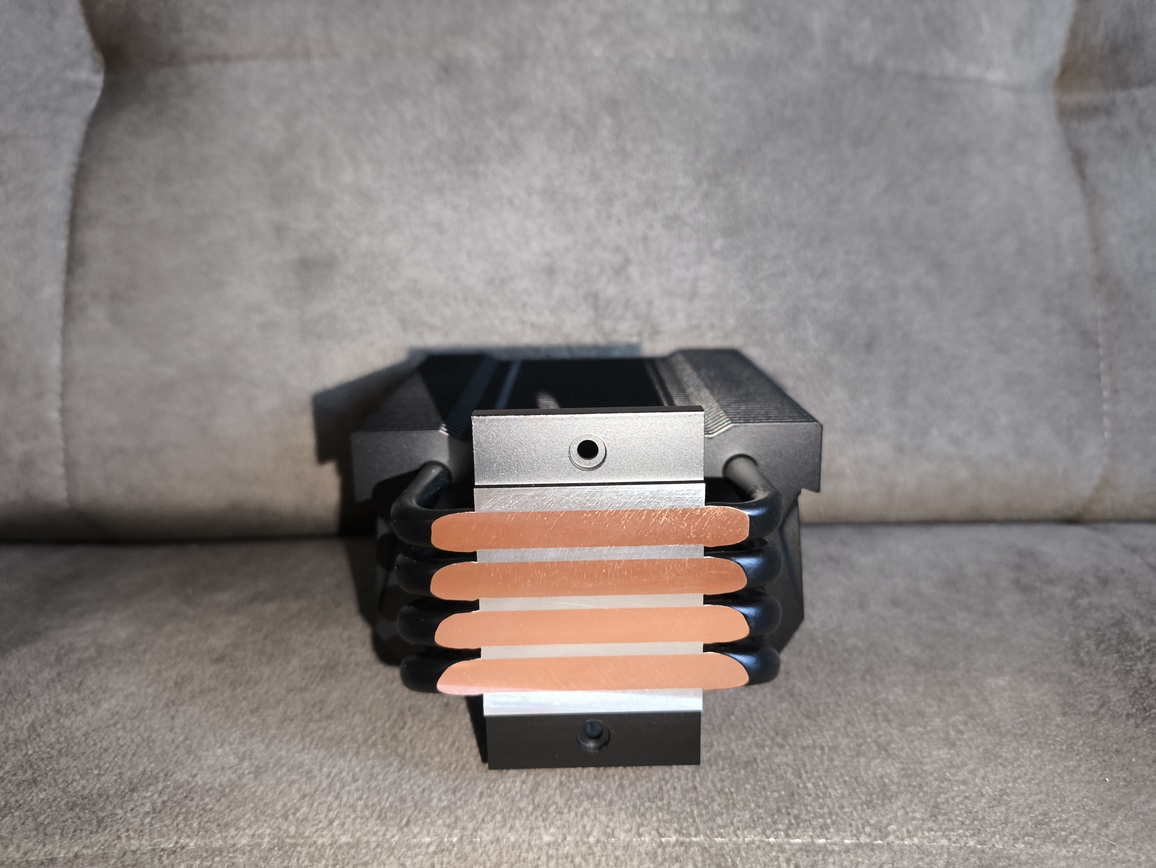 Radiator składa się z około czterdziestu aluminiowych finów, rozstawionych w odstępach bliskich 2 mm, z niewielkimi, produkcyjnymi odchyleniami. Przez całą strukturę przechodzą cztery rurki cieplne wygięte w kształt litery „U”, co w praktyce daje osiem punktów styku z żeberkami. Taka konfiguracja zapewnia równomierne rozprowadzanie energii cieplnej po całej powierzchni radiatora.