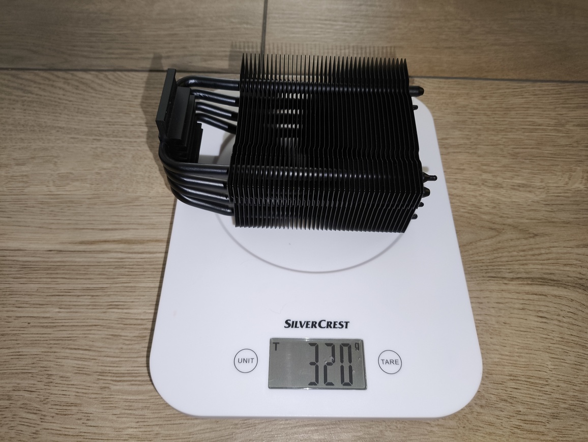 Waga zestawu wraz z wentylatorem wynosi około 436 gramów, natomiast sam radiator to około 322 gramy, co jest wartością bezpieczną dla płyty głównej nawet w mniejszych konstrukcjach.