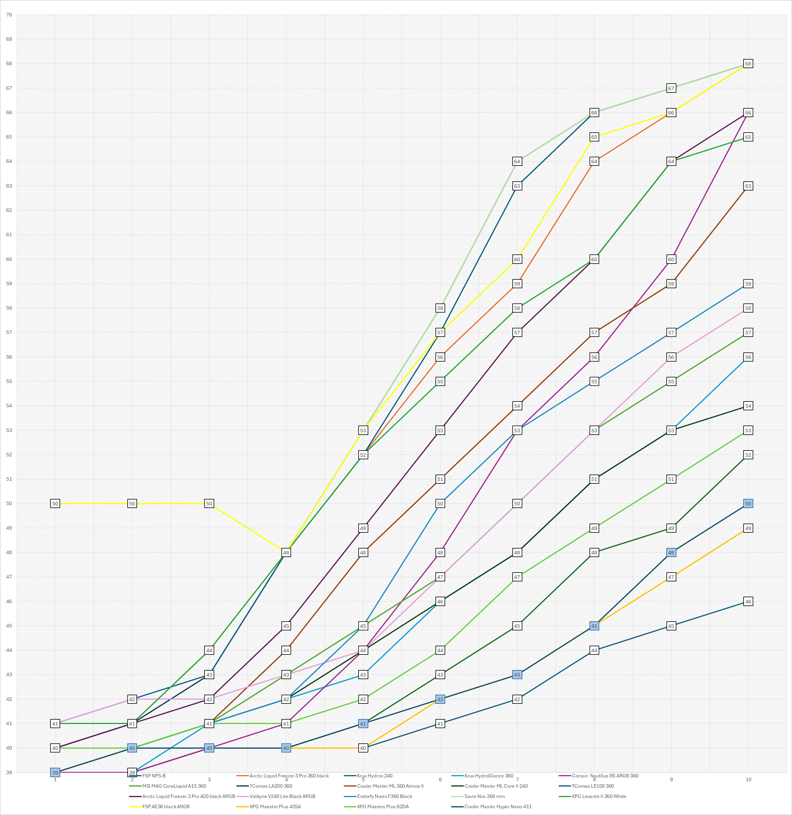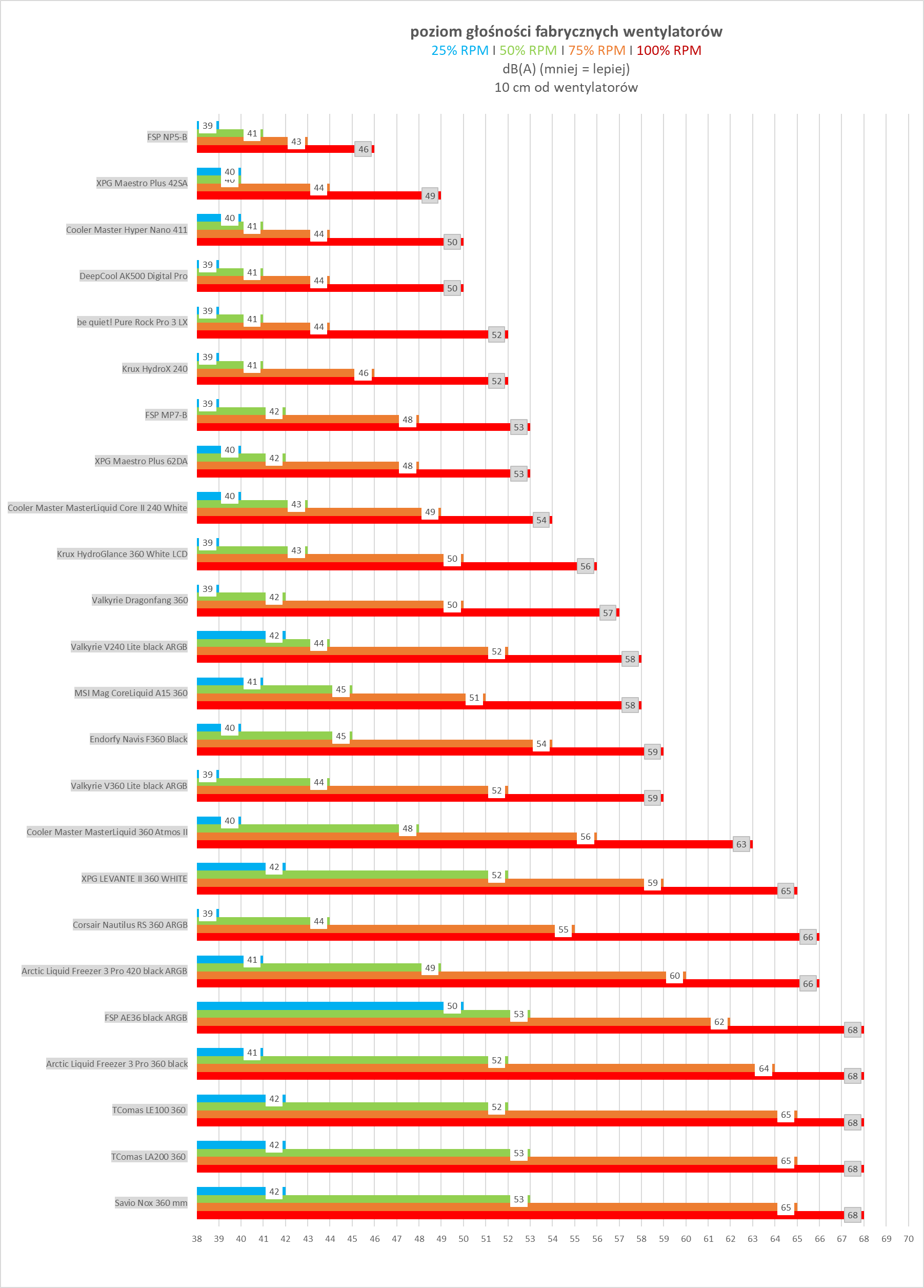 Pomiary głośności testowanego chłodzenia sumarycznie prezentują się bardzo dobrze, co należy uznać za spory plus patrząc na to, że na wyposażeniu mamy tu wentylator 92 mm rozpędzający się maksymalnie do 2500 RPM.