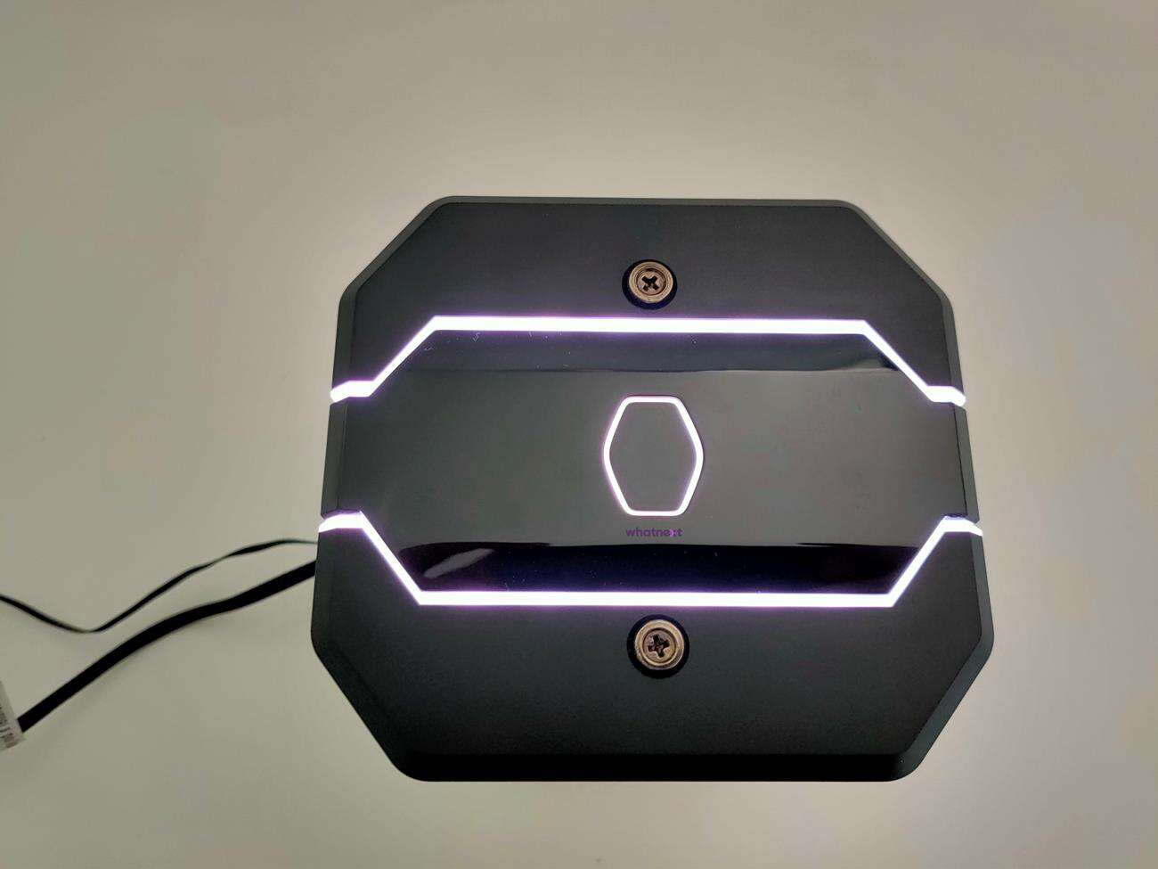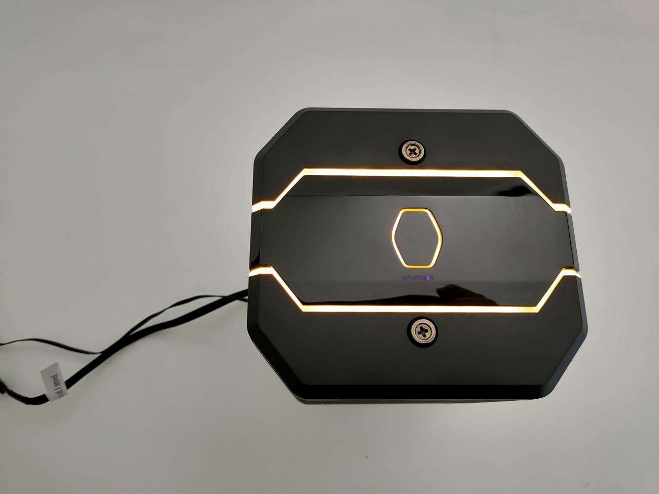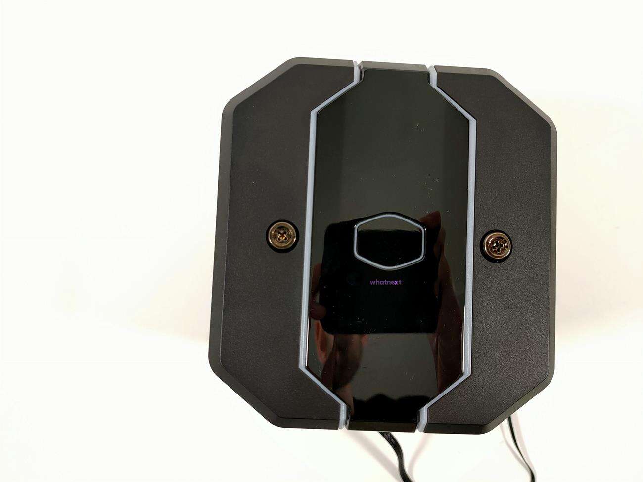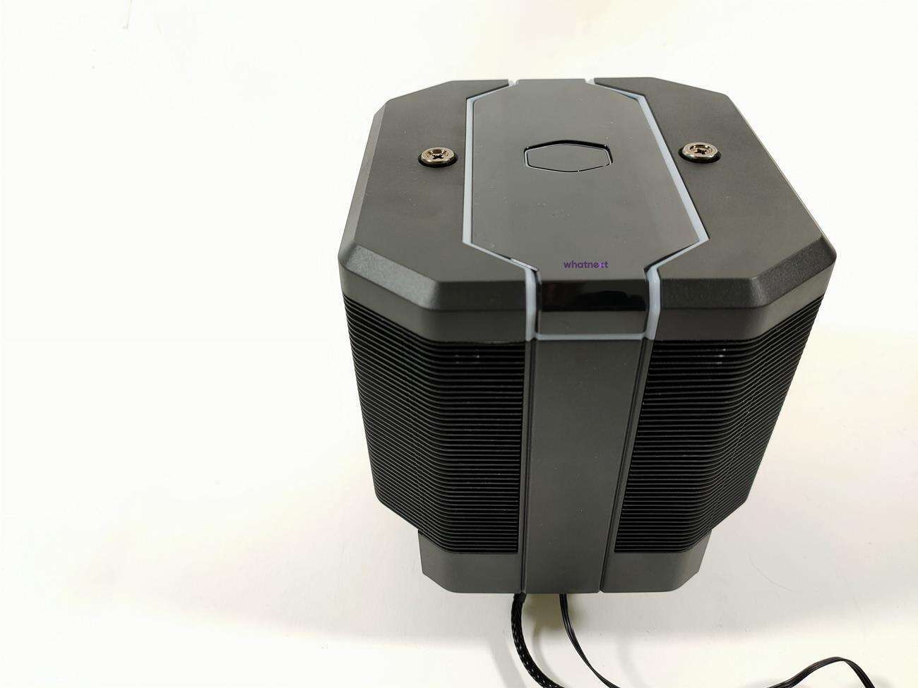Cooler Master MA620M na pewno świetnie wygląda. Cooler jest cały czarny, radiator zabudowy, a na górze jest podświetlenie ARGB. W obudowie z oknem będzie się on naprawdę znakomicie prezentował. Na jednym z boków macie naklejkę wskazującą przepływ powietrza – można ją bez problemów odkleić.