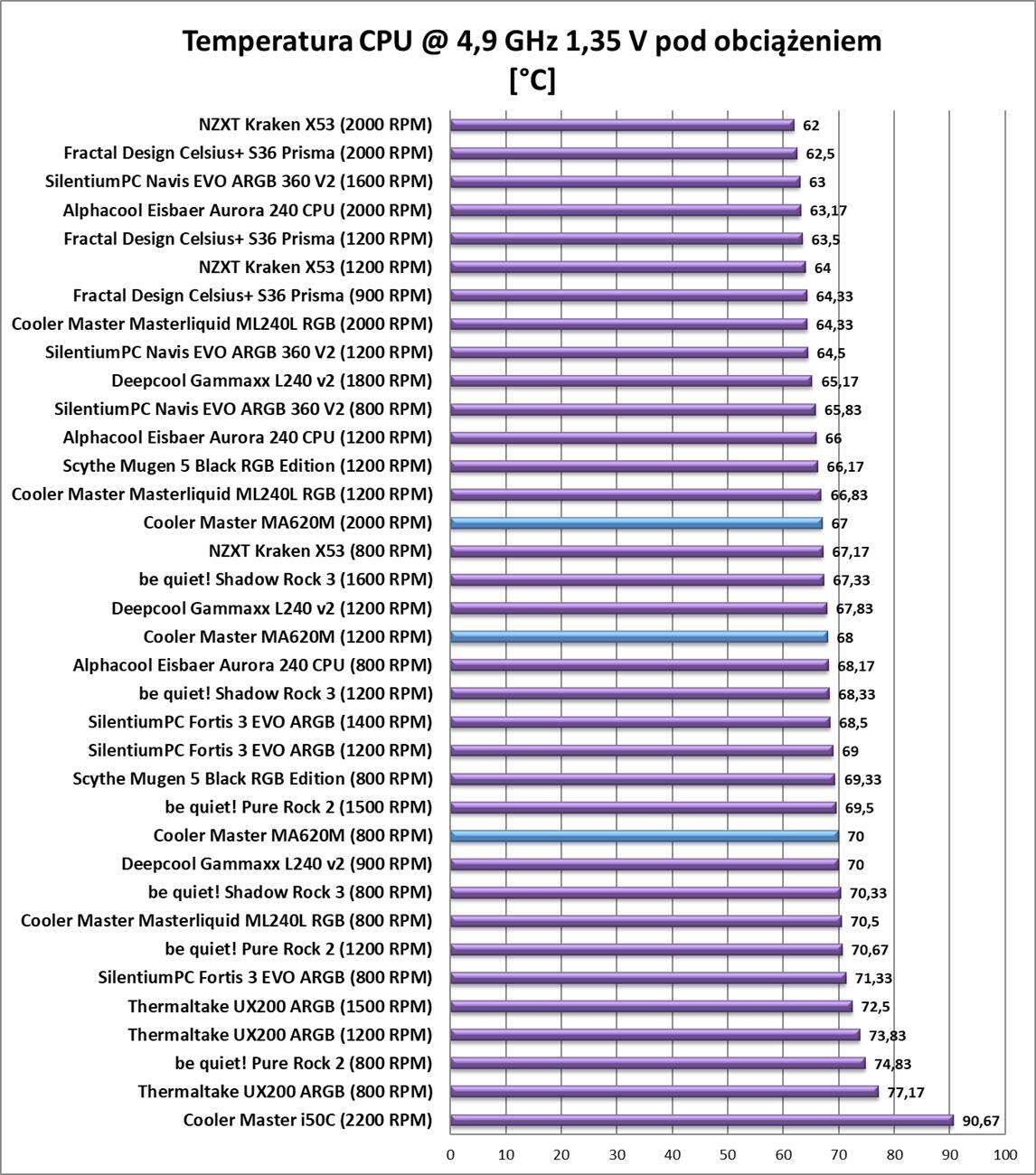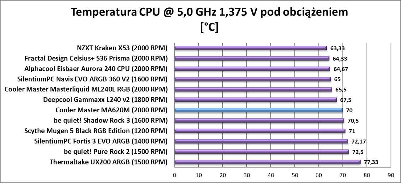 Niestety ale Cooler Master MA620M zawodzi w testach. Po takiej konstrukcji spodziewałem się czegoś znacznie lepszego. Wydajność jest oczywiście dobra, ale nie wybitna. Cooler wypada prawie na równie ze znacznie tańszym chłodzeniem, co jest raczej negatywnym zaskoczeniem. Cooler Master deklarował wydajnosć na poziomie AiO, a do tego jeszcze daleko. Cooler Master MA620M jest za to bardzo cichy. Nawet na 2000 RPM nie jest wybitnie głośno, na niższych obrotach praktycznie go nie usłyszycie.