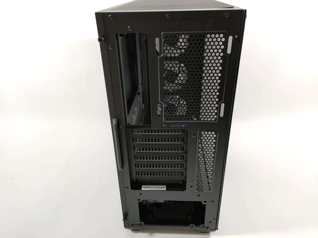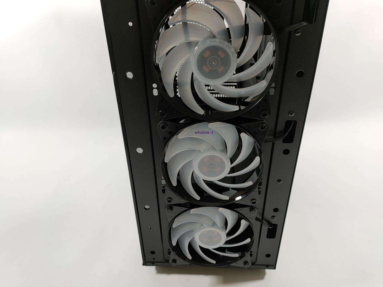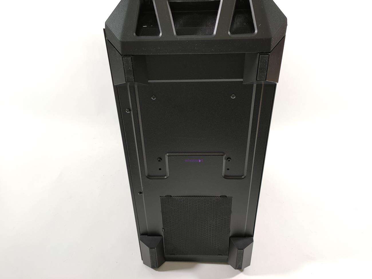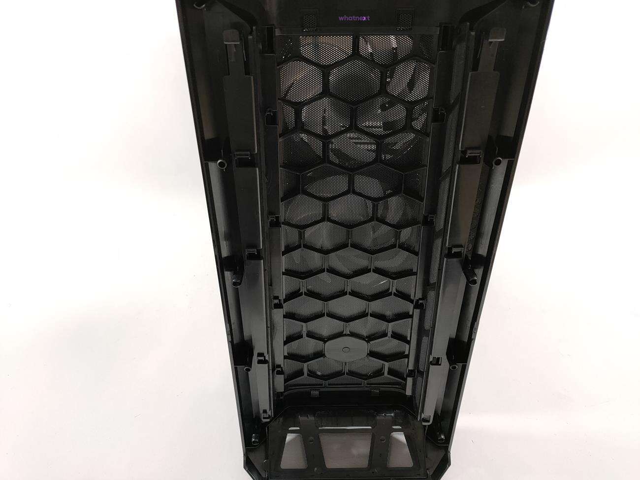 Ten jest całkowicie inny, choć dalej jest wykonany z siatki mesh. Tym razem jednak po bokach i na dole znajdują się dodatkowe ofiltrowane otwory. Filtry można wyjąć i wyczyścić, co jest sporym plusem. Po zdjęciu panelu widoczne są trzy wentylatory ARGB – całość naprawdę nieźle wygląda. Poza tym pozostałe części zewnętrznego wyglądu są identyczne jak u poprzednika. No może z wyjątkiem koloru – tym razem mamy do czynienia z czarną obudową.
