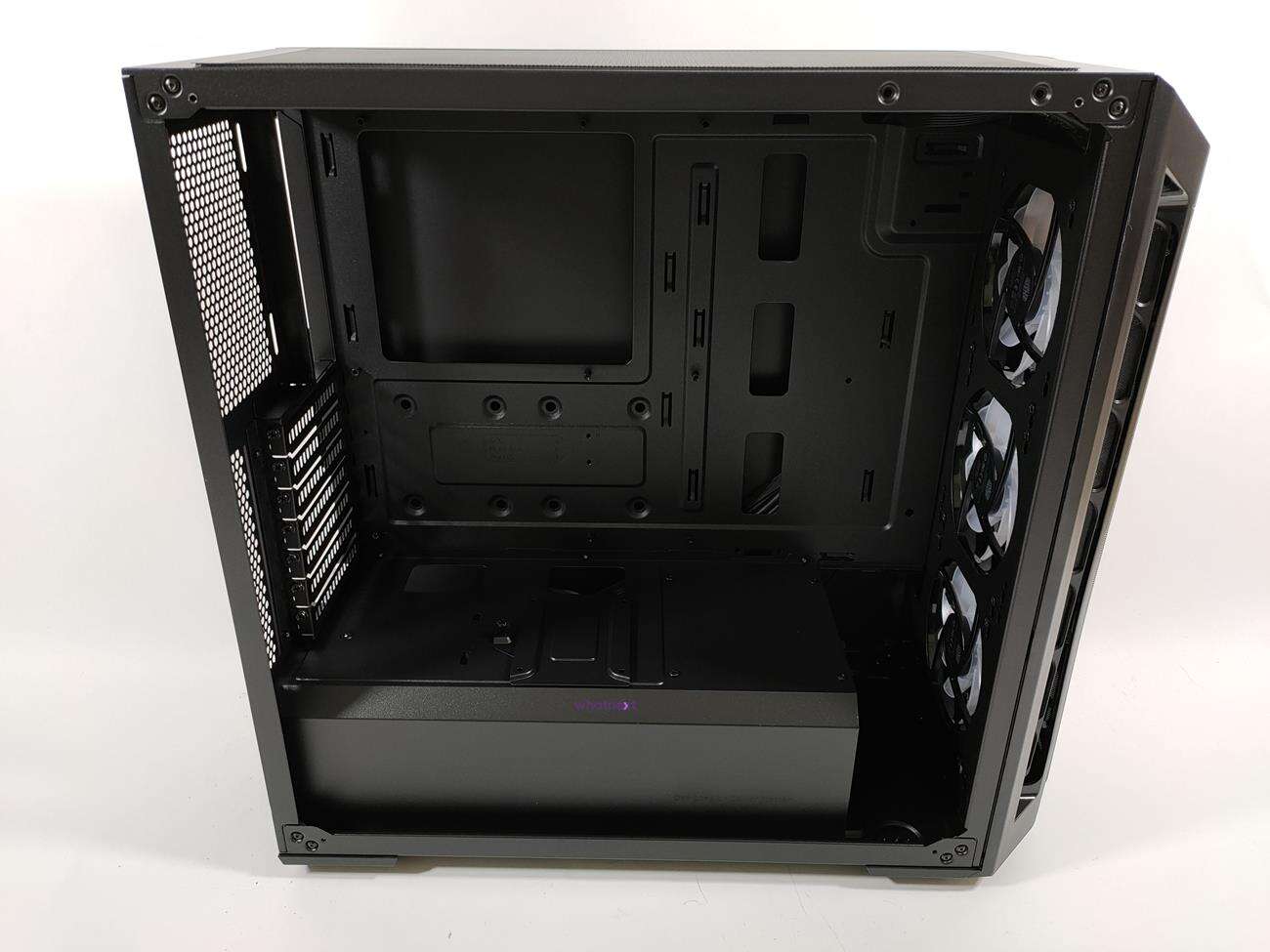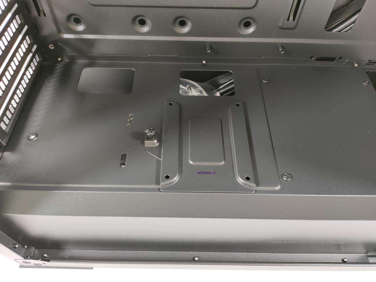 Wnętrze pod wieloma względami przypomina te w Cooler Master Masterbox TD500 Mesh White, ale jest kilka zmian. Na piwnicy jest dodatkowe miejsce na dysk 2,5 cala. Nie ma także wycięcia na zasilacz, co akurat dla mnie jest plusem. Poza tym nie ma gumowych przelotek na otworach na okablowanie. To tak naprawdę wszystkie zmiany.