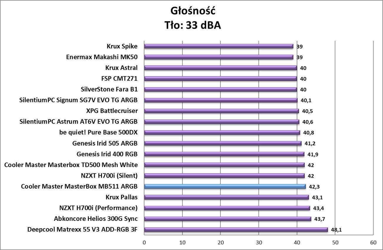 - Głośność zmierzyłem przy zamkniętej obudowie z odległości 20 cm od środka lewego boku – tło wynosiło 33 dBA.