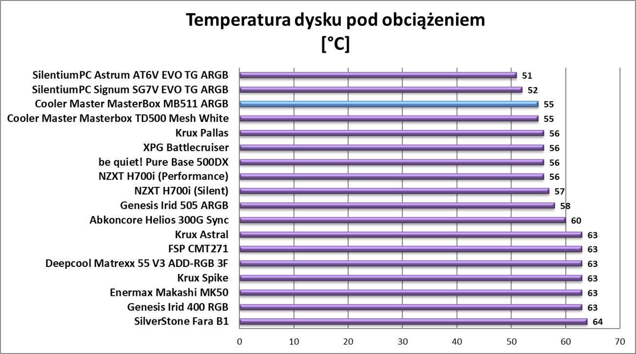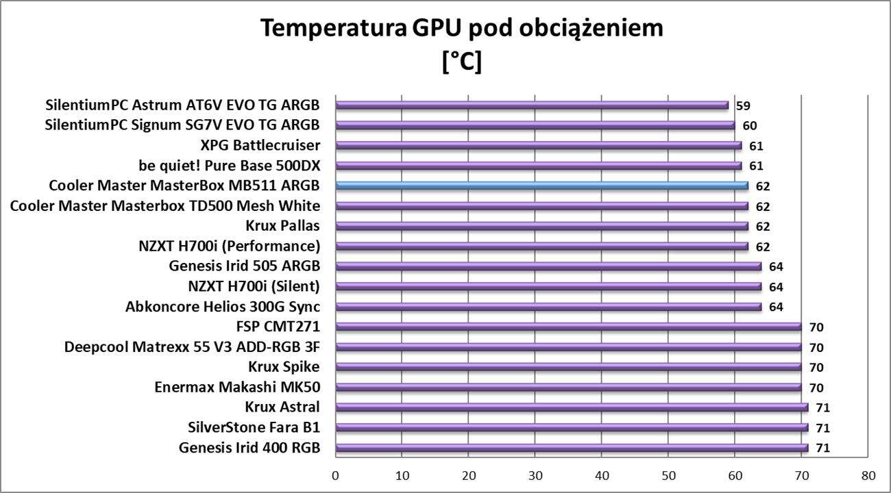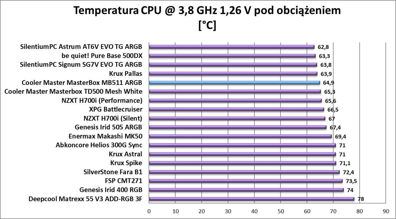 Wyniki testów są praktycznie identyczne jak w modelu Cooler Master Masterbox TD500 Mesh White. Nie ma jednak tutaj zaskoczenia – konstrukcja jest praktycznie identyczna. Oznacza to niskie temperatury przy trochę większej głośności. Obudowa oferuje więc bardzo dobry przepływ powietrza i konstrukcja z przednim panelem mesh bardzo dobrze sprawdza się w praktyce.