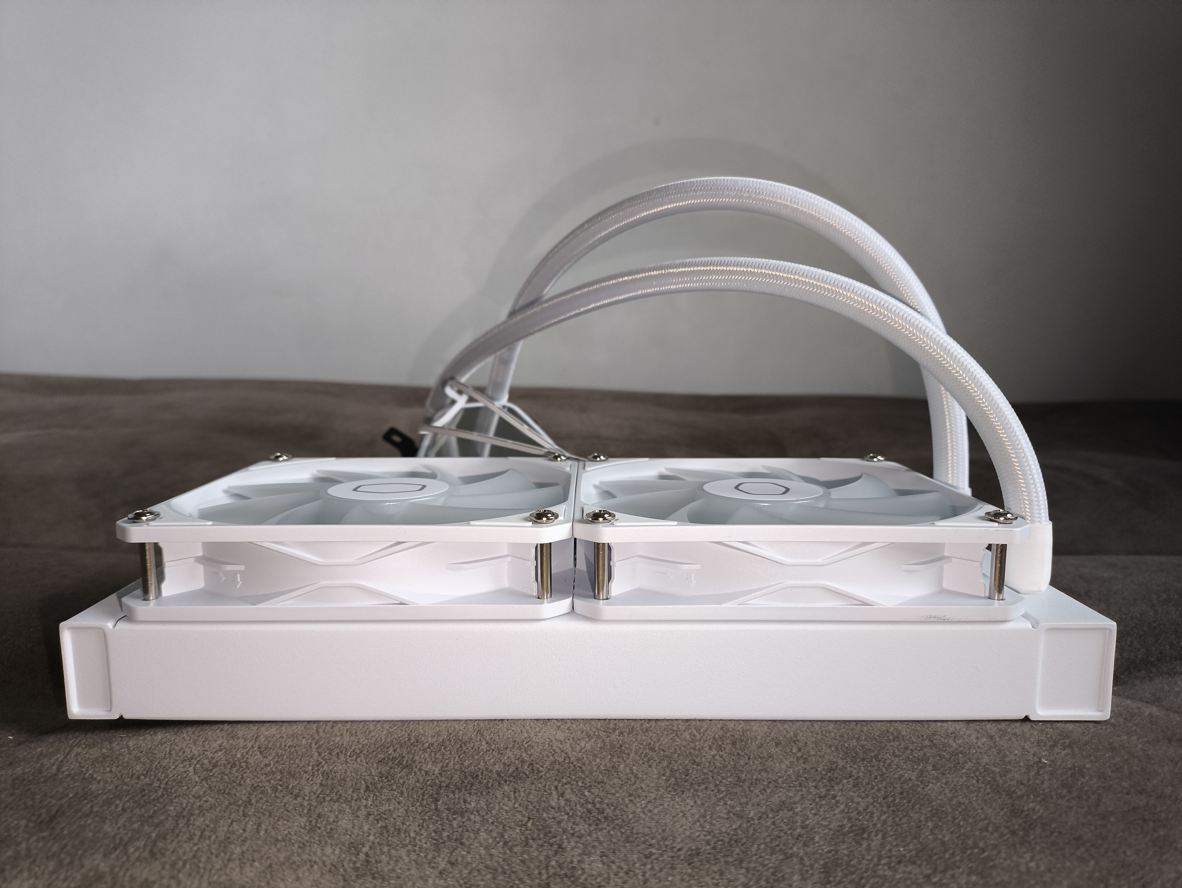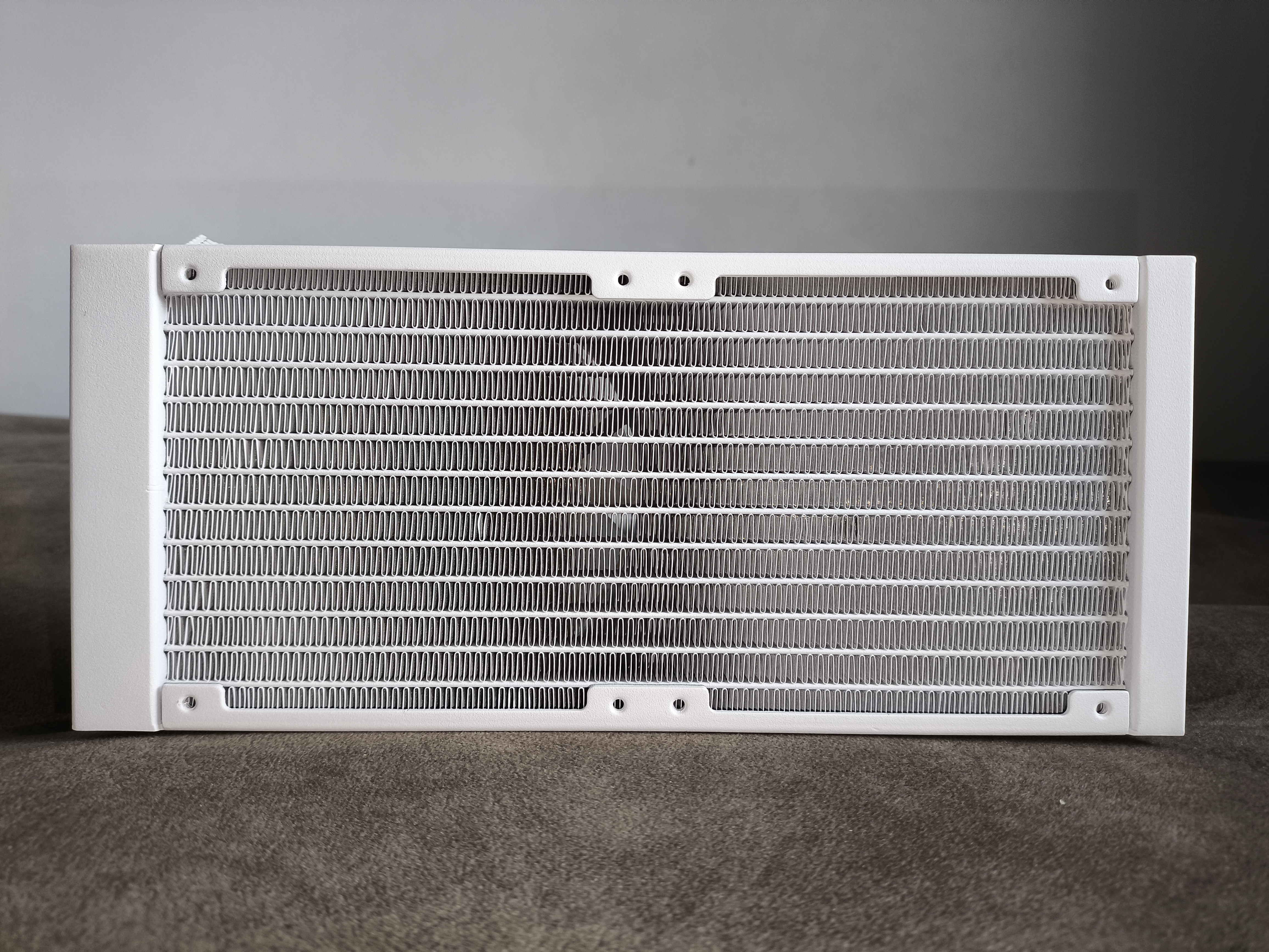 Radiator w całości wykonano z aluminium – ech, nic odkrywczego, tak jest w każdym chłodzeniu AIO. Jego wymiary to 277 x 119,2 x 27,2 mm (długość / szerokość / wysokość). Całkowita grubość zestawu po zamontowaniu wentylatorów wynosi 53,2 mm (z uwzględnieniem główek śrub mocujących).