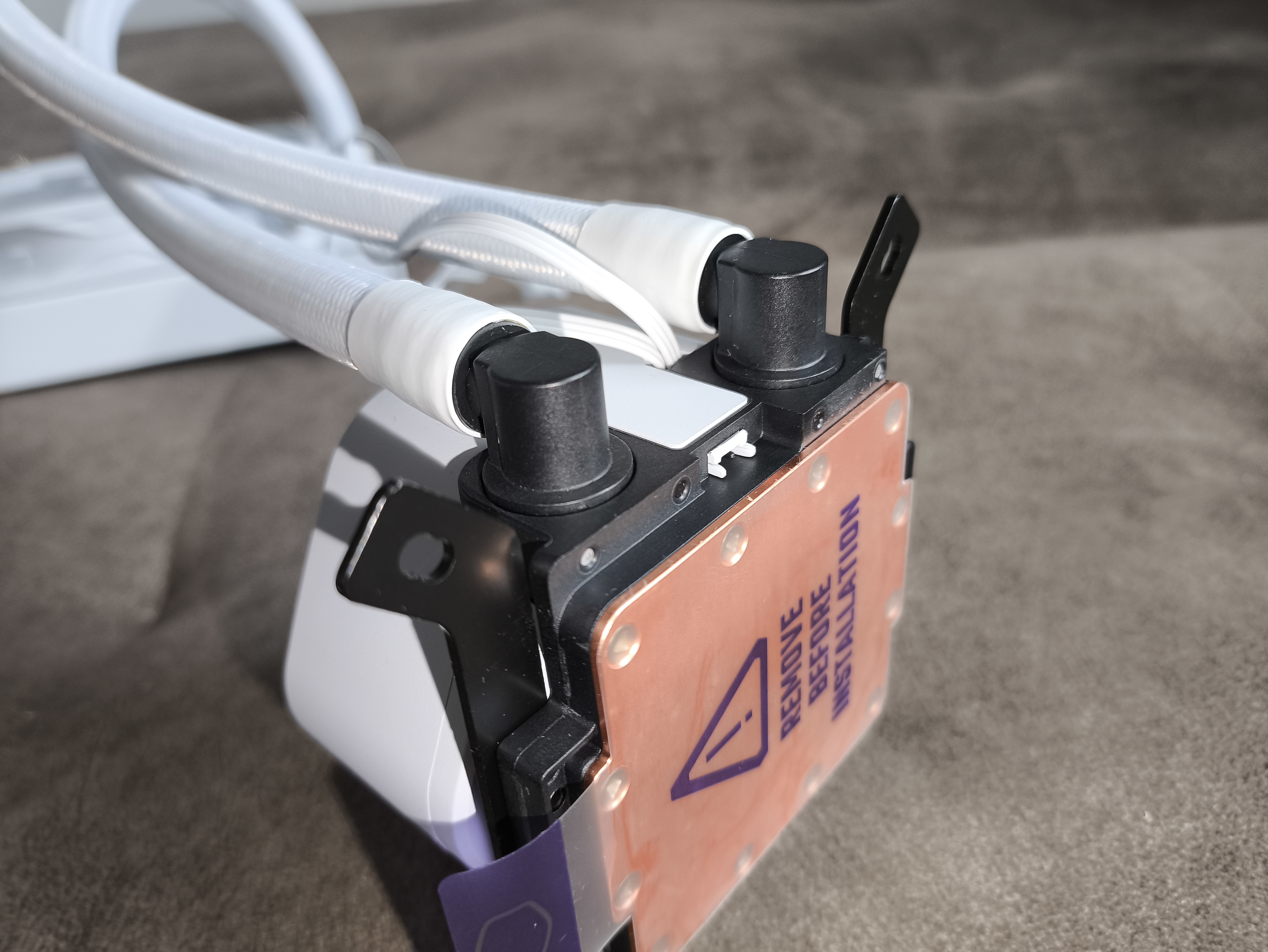 Zgodnie ze specyfikacją, długość giętkich przewodów pomiędzy blokiem a radiatorem wynosi 400 mm, co należy uznać za pozytywny aspekt – większy zapas długości zawsze zwiększa elastyczność montażu. Połączenia przewodów z króćcami osłonięto czarnymi obejmami, nadającymi im schludny wygląd. Przewody pokryto też fajnym w dotyku oplotem w celu uzyskania estetyczniejszego wyglądu.