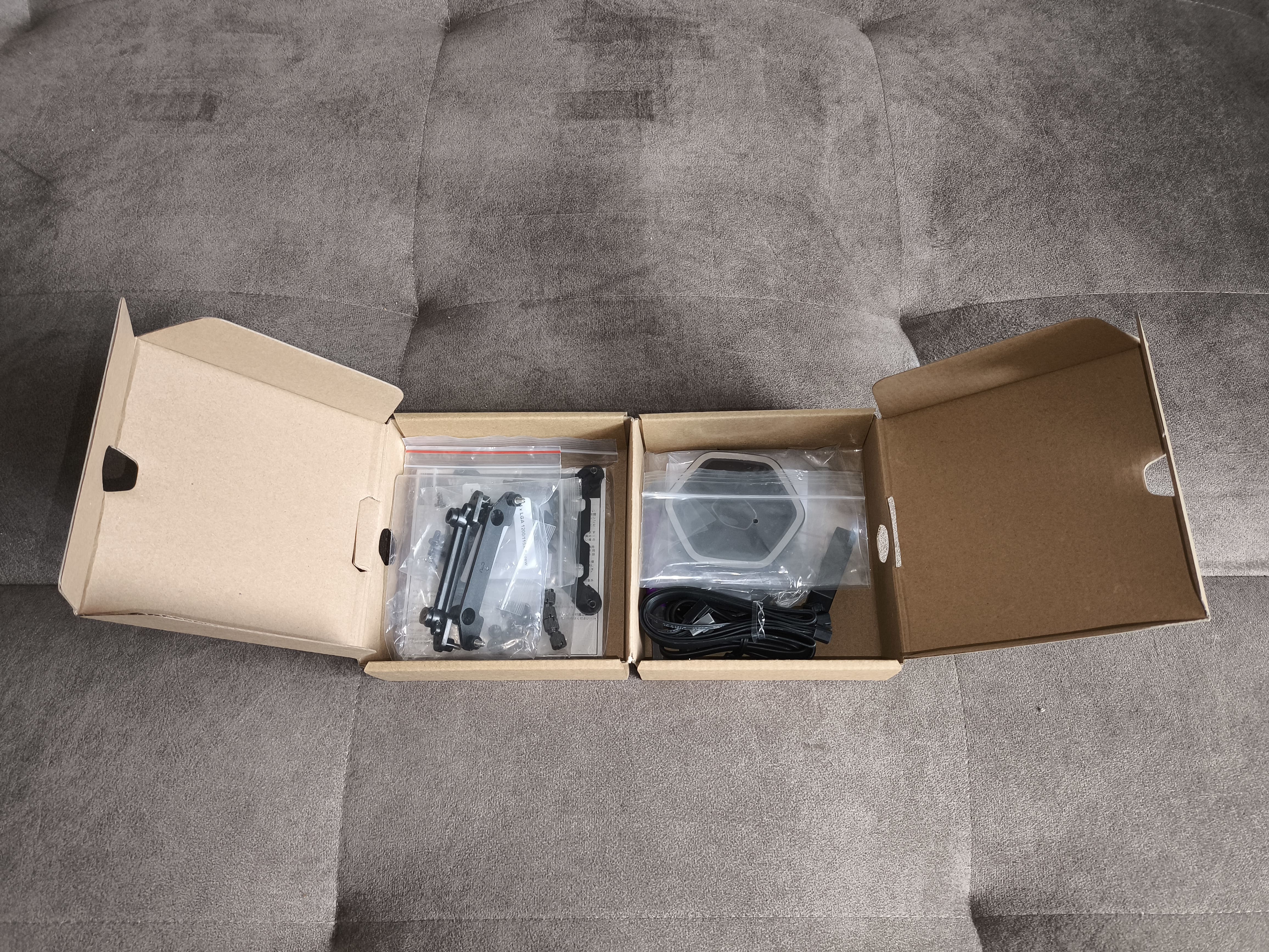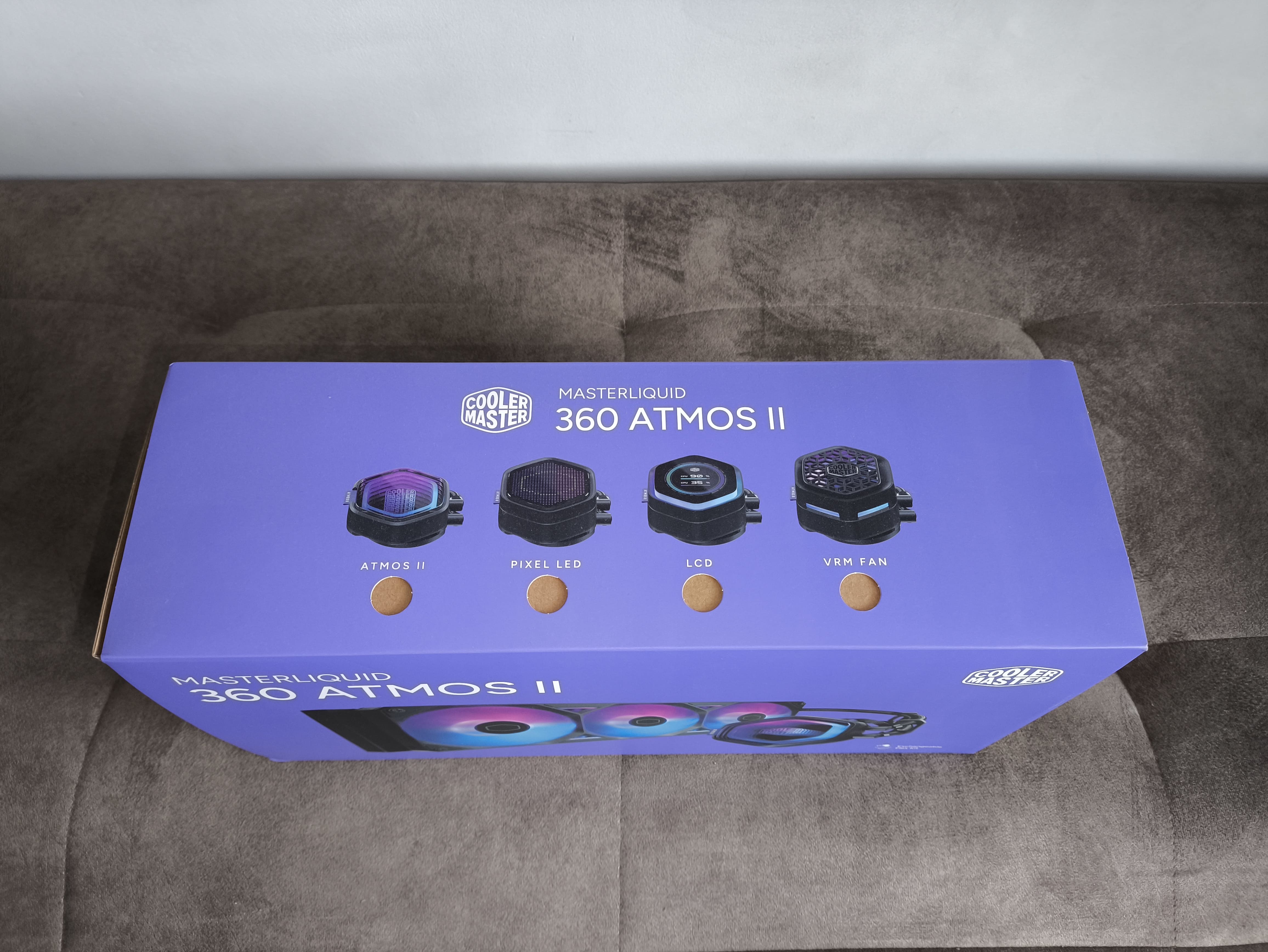 Cooler Master MasterLiquid 360 Atmos II dostarczany jest w opakowaniu utrzymanym w charakterystycznej dla producenta kolorystyce – dominujący, przyjemny dla oka odcień fioletu stanowi tło dla zdjęcia chłodzenia z efektem lustrzanego odbicia na pokrywie bloku. W lewym górnym rogu widnieje nazwa modelu, a po prawej logo Cooler Master.