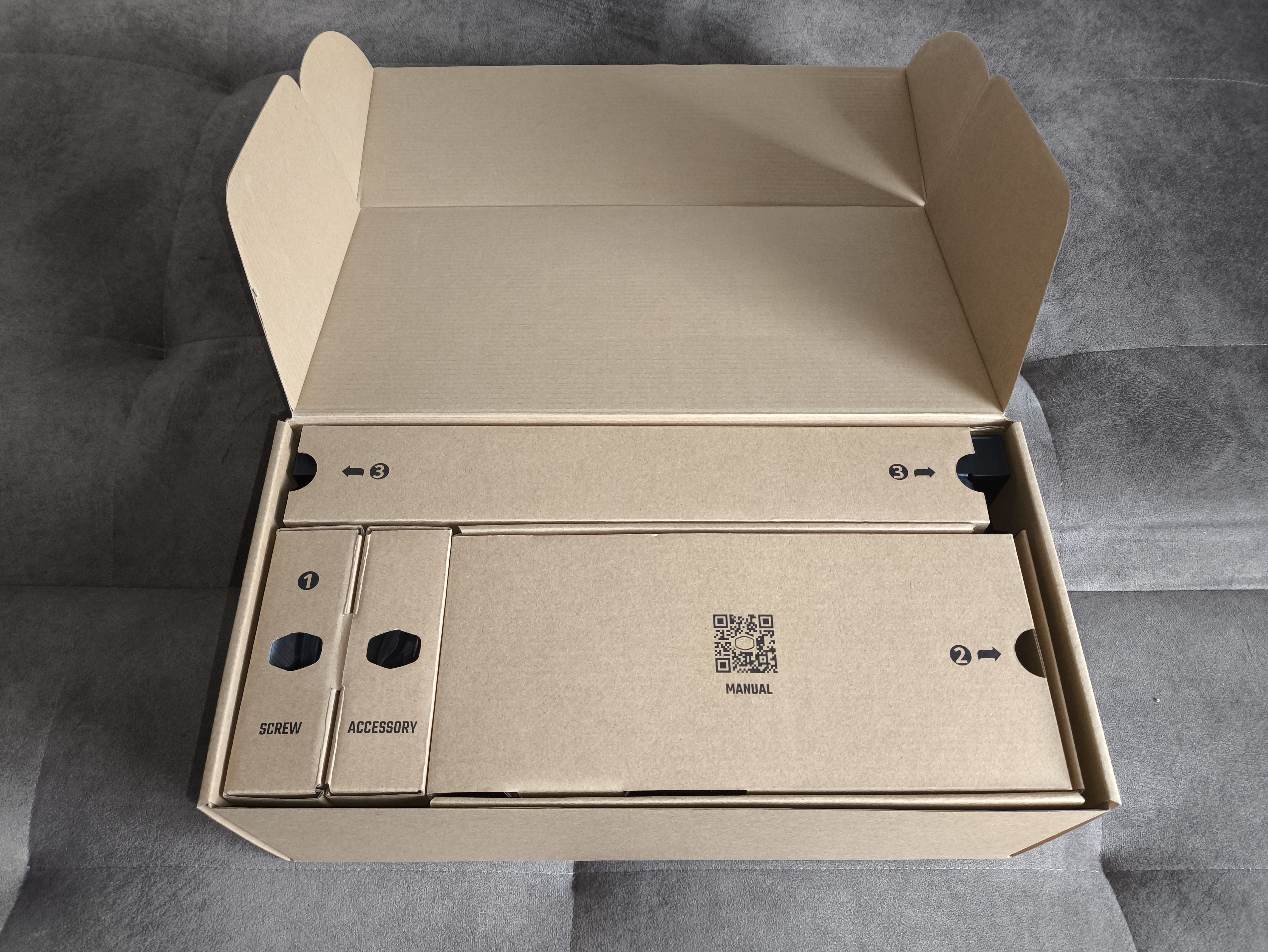 Na obu końcach widnieje prosty panel z tektury w kolorze naturalnym, ozdobiony logotypem i hasłem przewodnim firmy. W dolnej części umieszczono dane kontaktowe do trzech biur producenta, a po bokach znajdują się dwa kody QR – jeden prowadzi do strony głównej Cooler Master, a drugi umożliwia rejestrację produktu.
