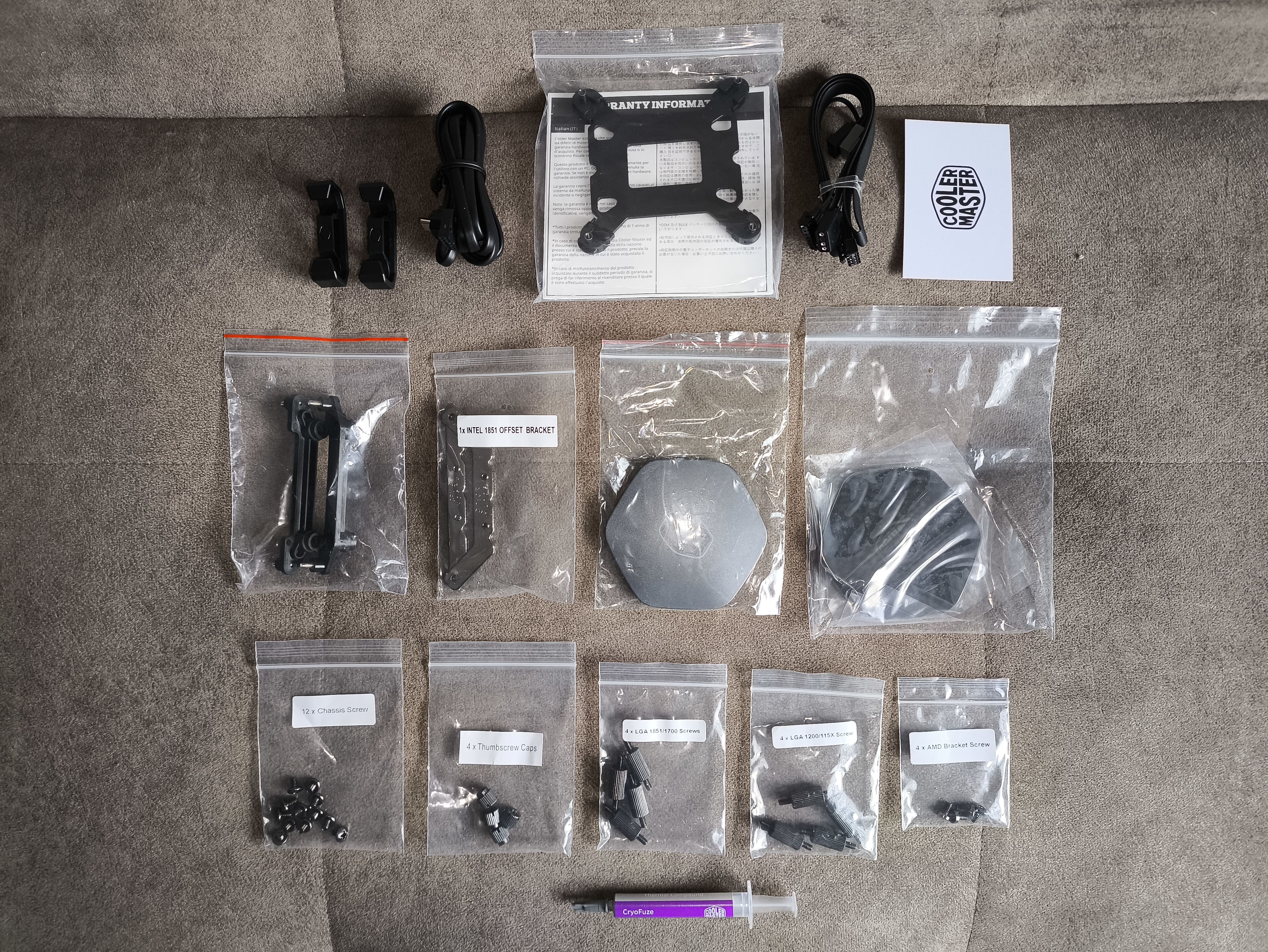 Na jednym z boków opakowania, które może nie być jeszcze finalną wersją handlową, producent informuje, że serie ATMOS II, Pixel LED oraz LCD trafią na rynek, natomiast wariant z dodatkowym wentylatorem VRM jest wciąż na etapie rozważań. Cooler Master prawdopodobnie zaznaczy stosowną wersję chłodzenia na detalicznym opakowaniu. Panel boczny został zresztą powielony po obu stronach kartonu.