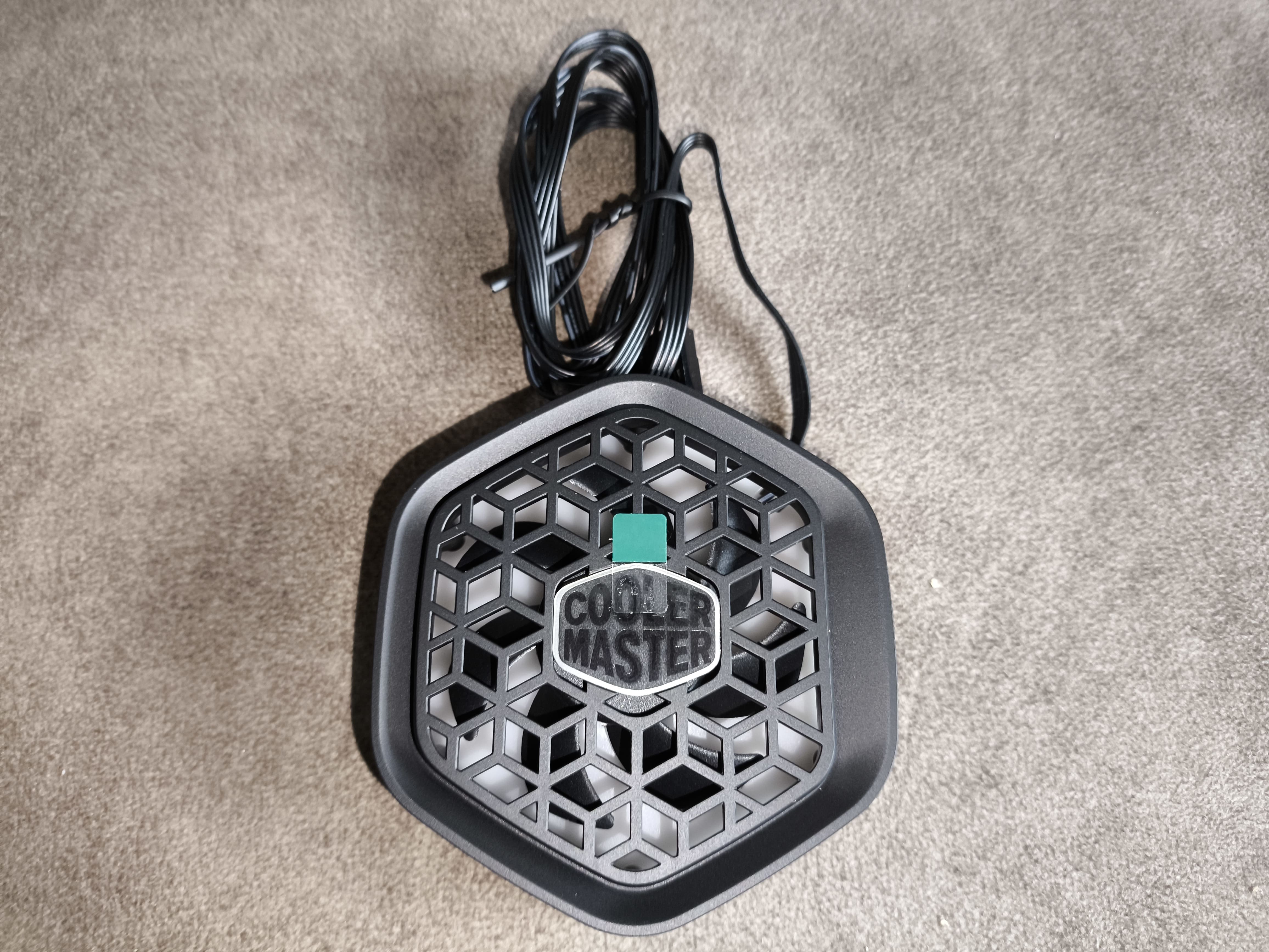 Pompka dostarczana jest z fabrycznie zamontowanymi uchwytami, umieszczonymi pod czarnym, plastikowym pierścieniem zewnętrznym. Górna część bazowo została natomiast przykryta efektowną pokrywą typu „infinity mirror”, w której centrum widnieje logo Cooler Master. Na samej górze umieszczono naklejkę z instrukcją „remove and grease on” (usuń i nałóż pastę), co nabiera sensu dopiero w późniejszym etapie montażu.