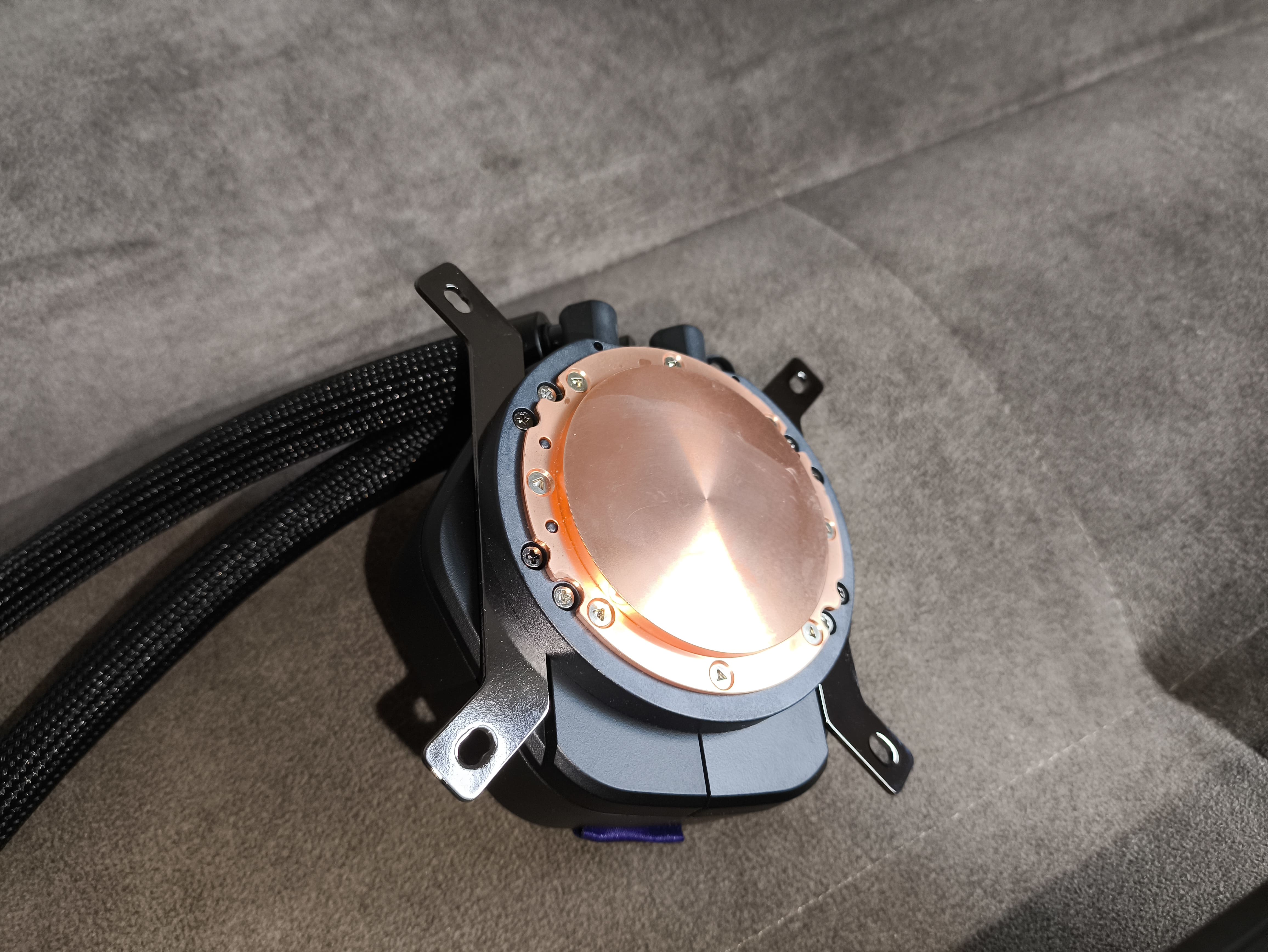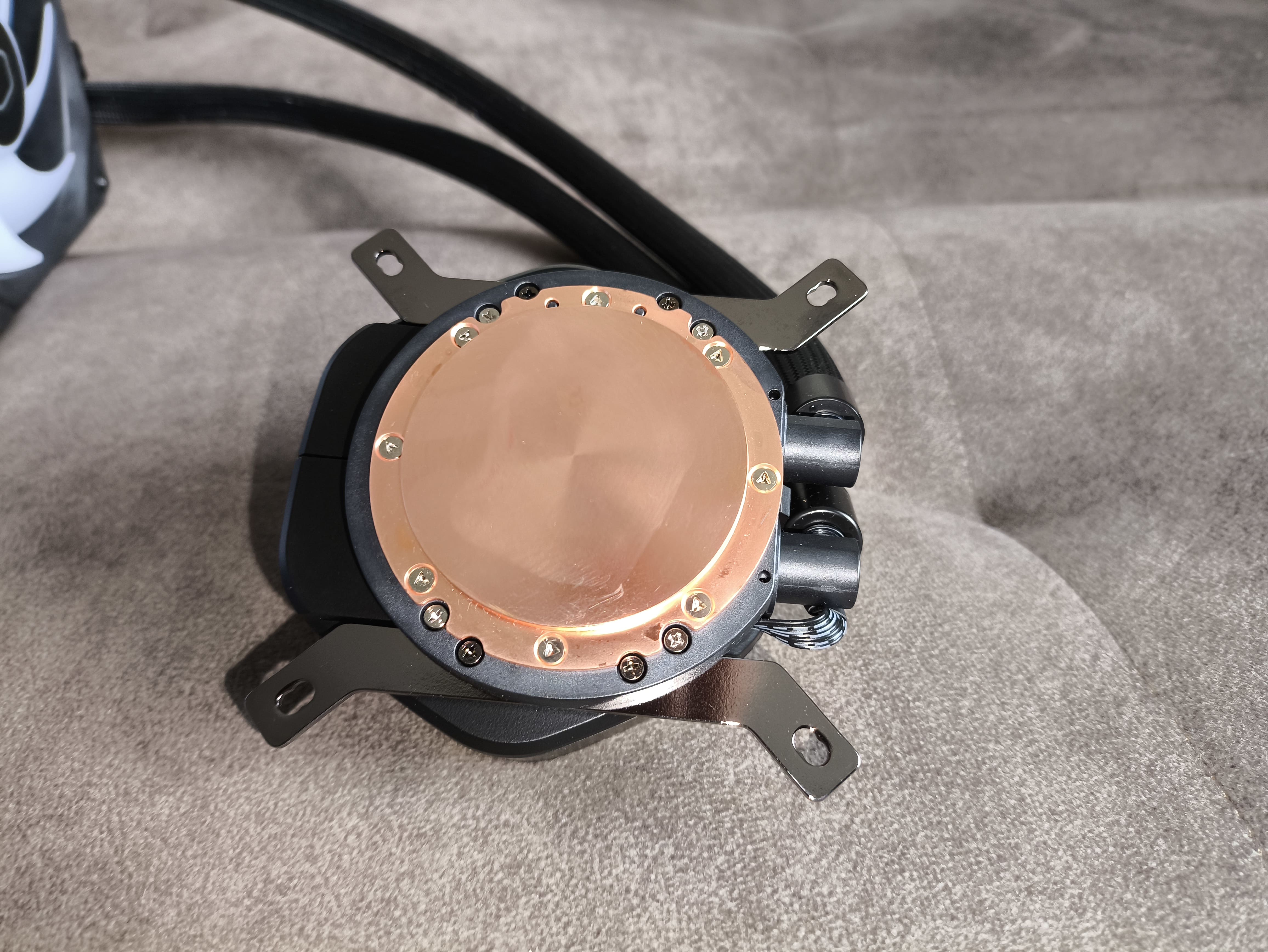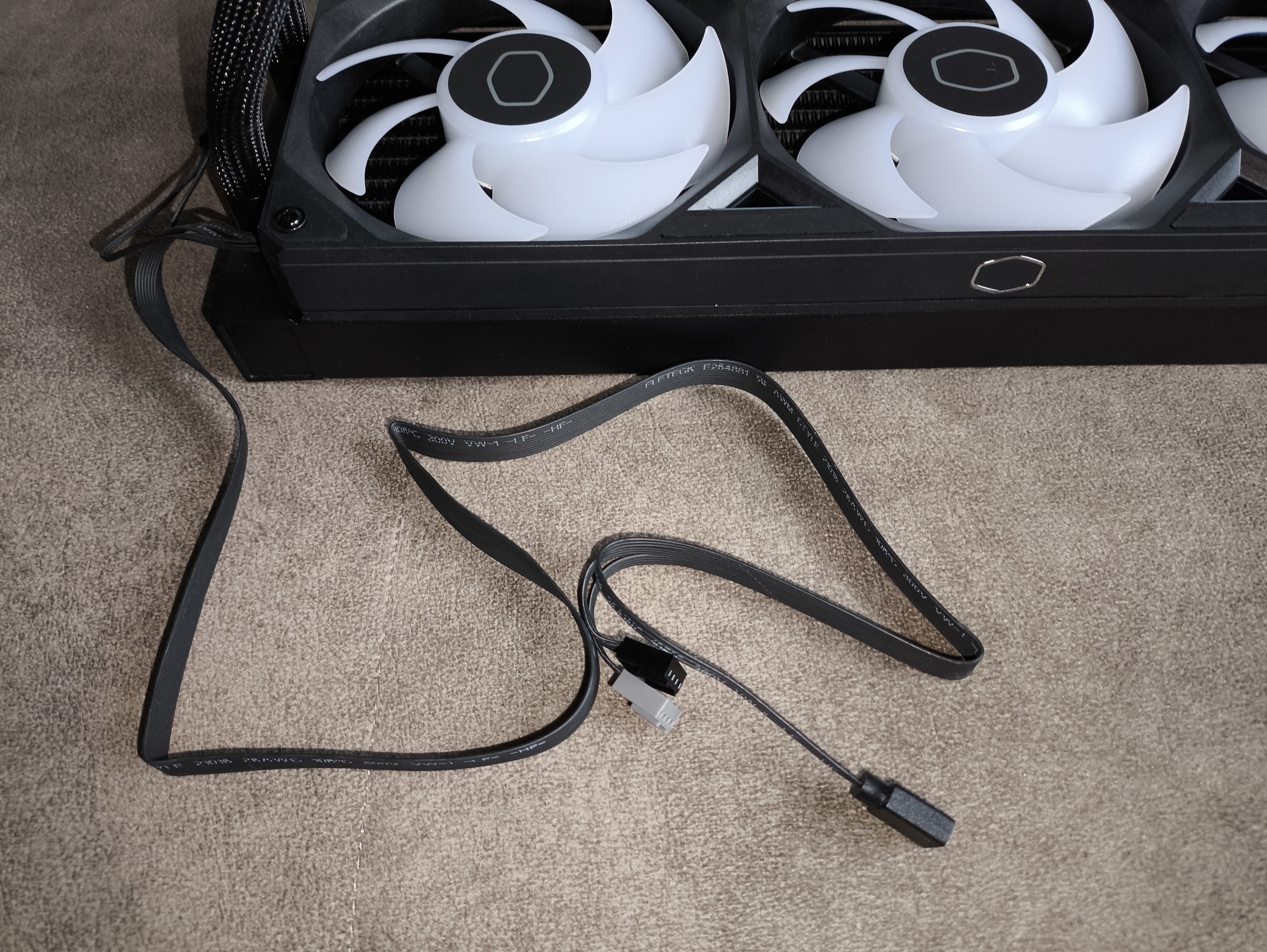 Na głowicy nie znajdziemy żadnych widocznych portów połączeniowych — przewody ukryto pod oplotem węższej z rurek. Rurki te mocowane są za pomocą obrotowych złączy (krućców) 90°, co pozwala im na swobodne ułożenie między CPU a obudową, minimalizując naprężenia.