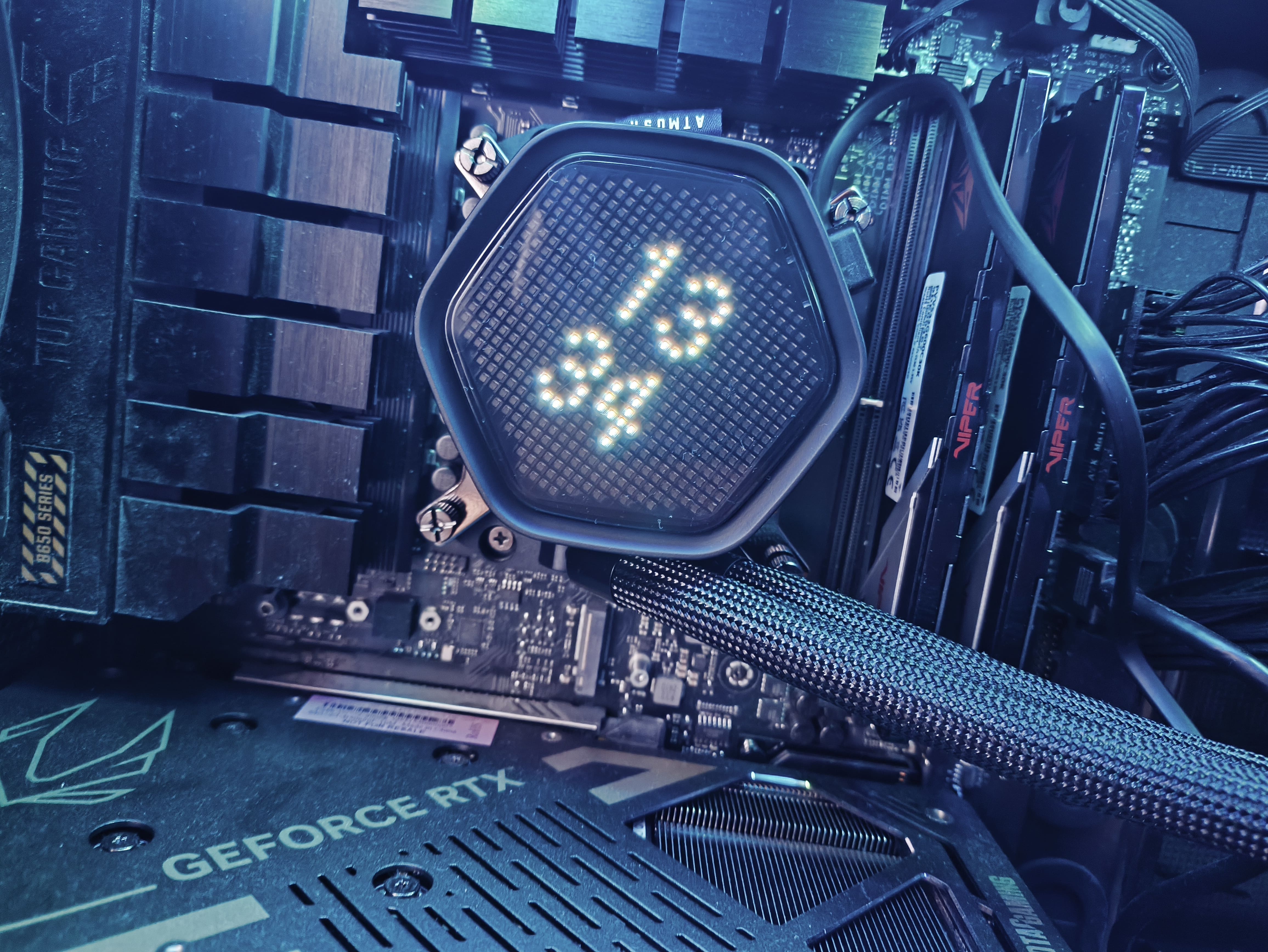 Każda pokrywa jest magnetycznie mocowana do pompki i podświetlana przez rozproszoną płytę ARGB. Prezentują się świetnie, montaż jest banalny, a działanie – bezproblemowe. Jedyny minus to sposób, w jaki zasilane są warianty z aktywnymi funkcjami. Pokrywy LED Pixel i LCD korzystają z kabla USB-C podłączanego do wewnętrznego złącza USB 2.0 na płycie głównej, natomiast wariant z wentylatorem VRM wymaga podpięcia do złącza CHA FAN.