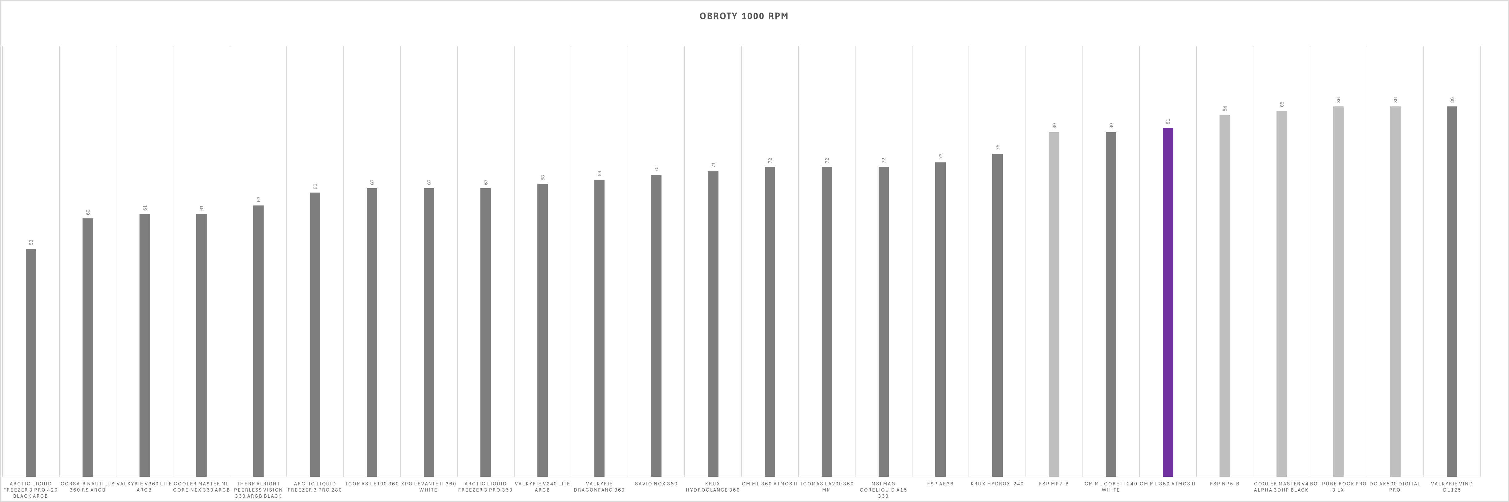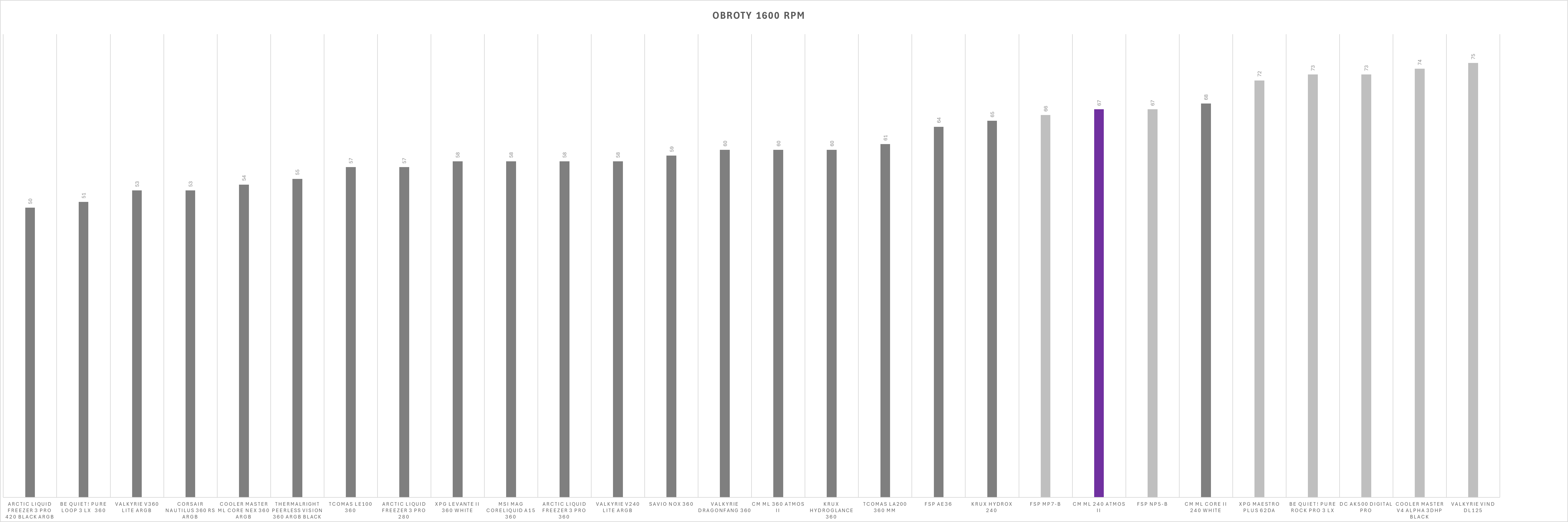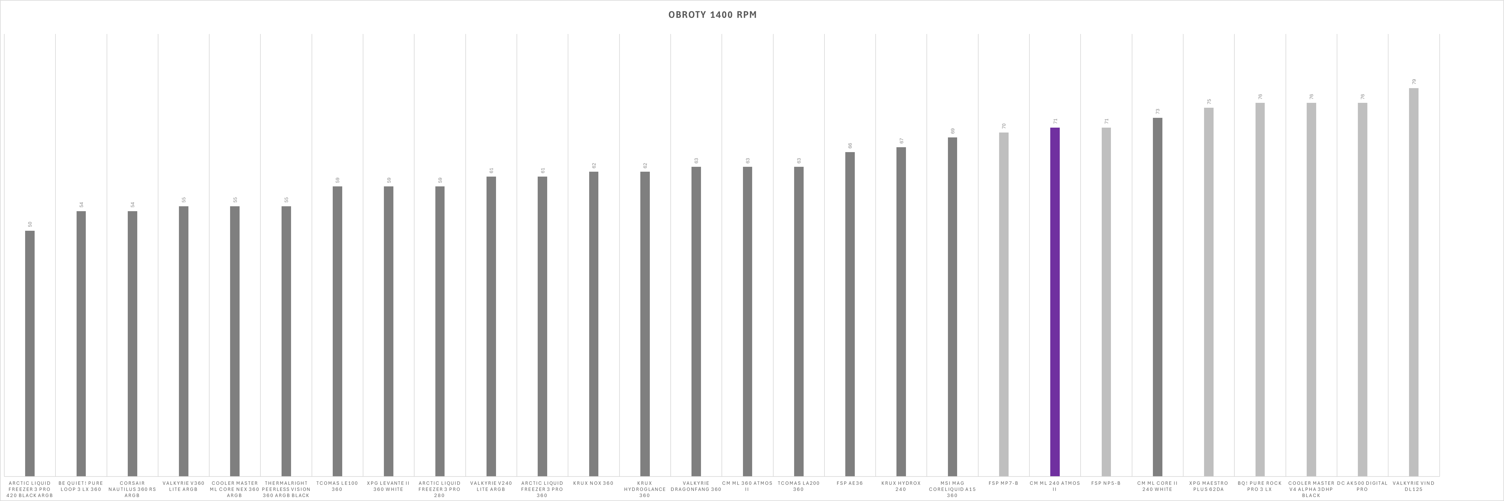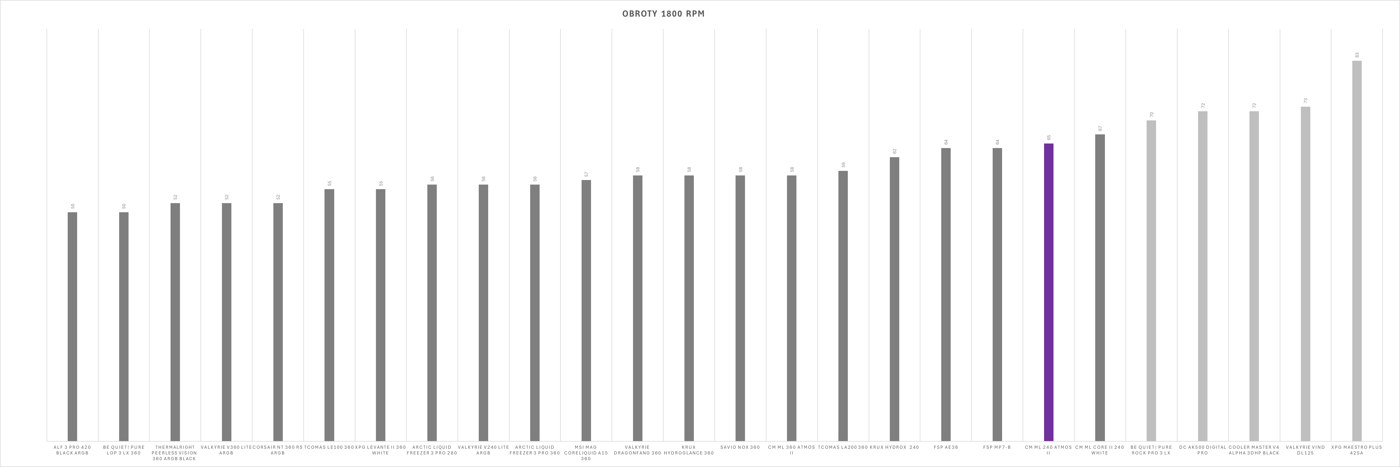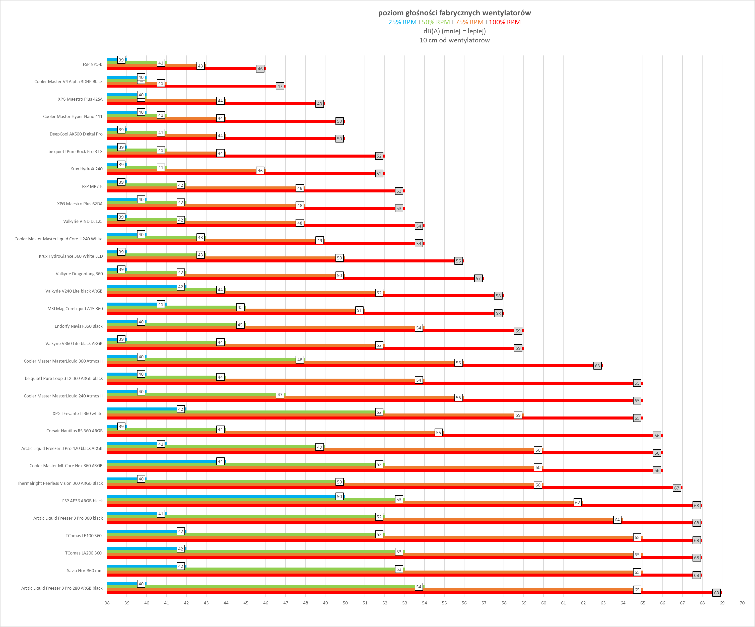Sytuacja zmienia się przy wyższych obrotach. Po przekroczeniu ~80% RPM wentylatory zaczynają być wyraźnie słyszalne (58 dB), a przy maksymalnej prędkości generowany hałas dochodzi do 65 dB. To już poziom, który trudno zignorować – w praktyce bowiem oznacza on bardzo wyraźny szum i plasuje zestaw wśród tych głośniejszych rozwiązań.