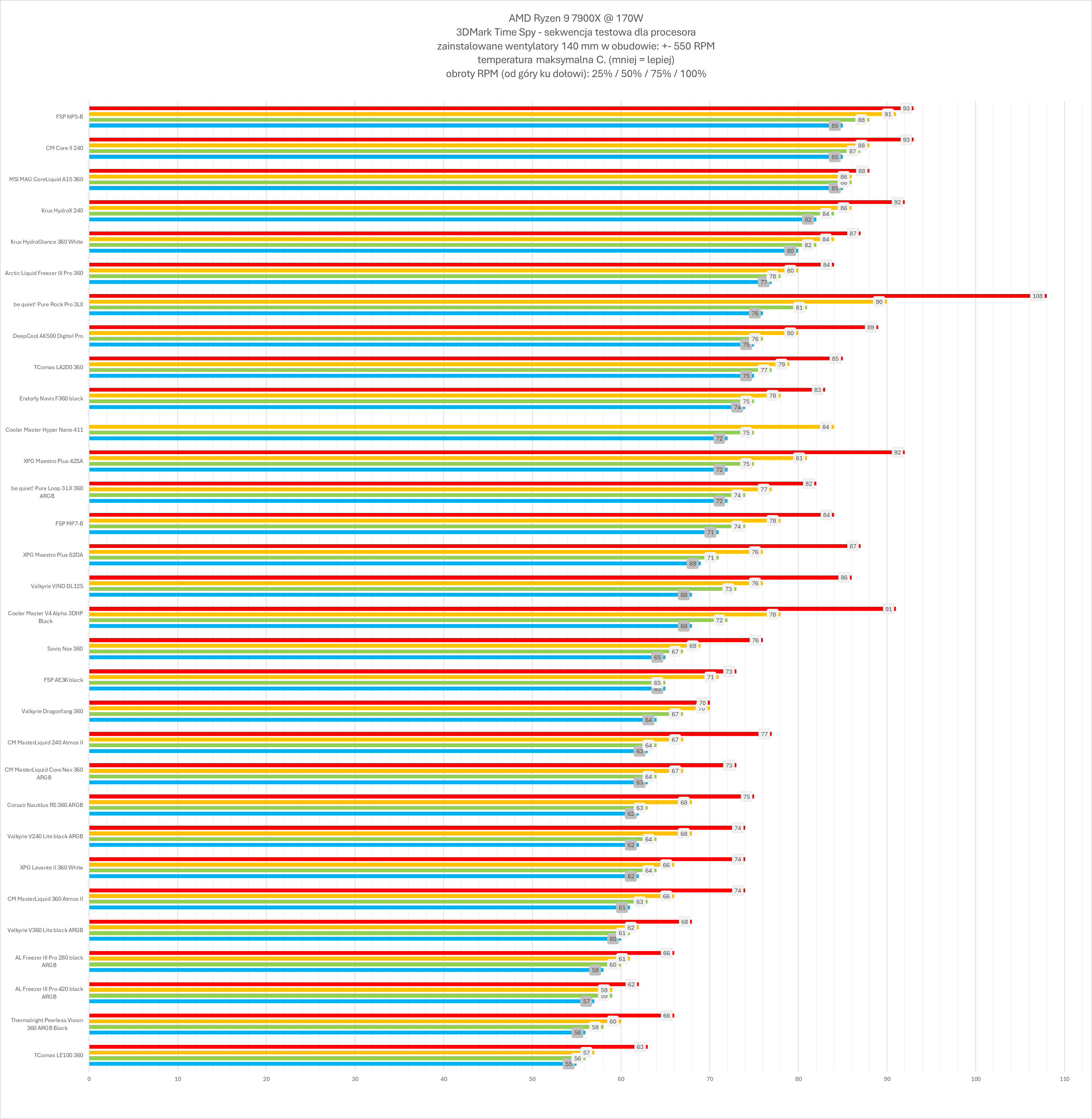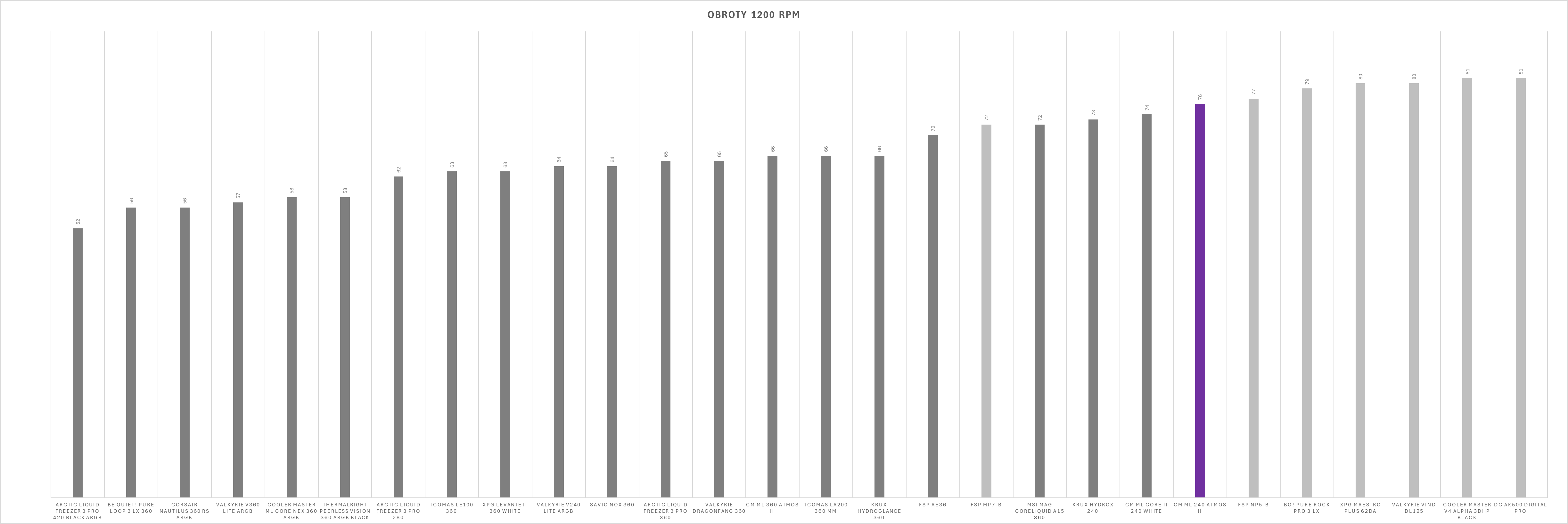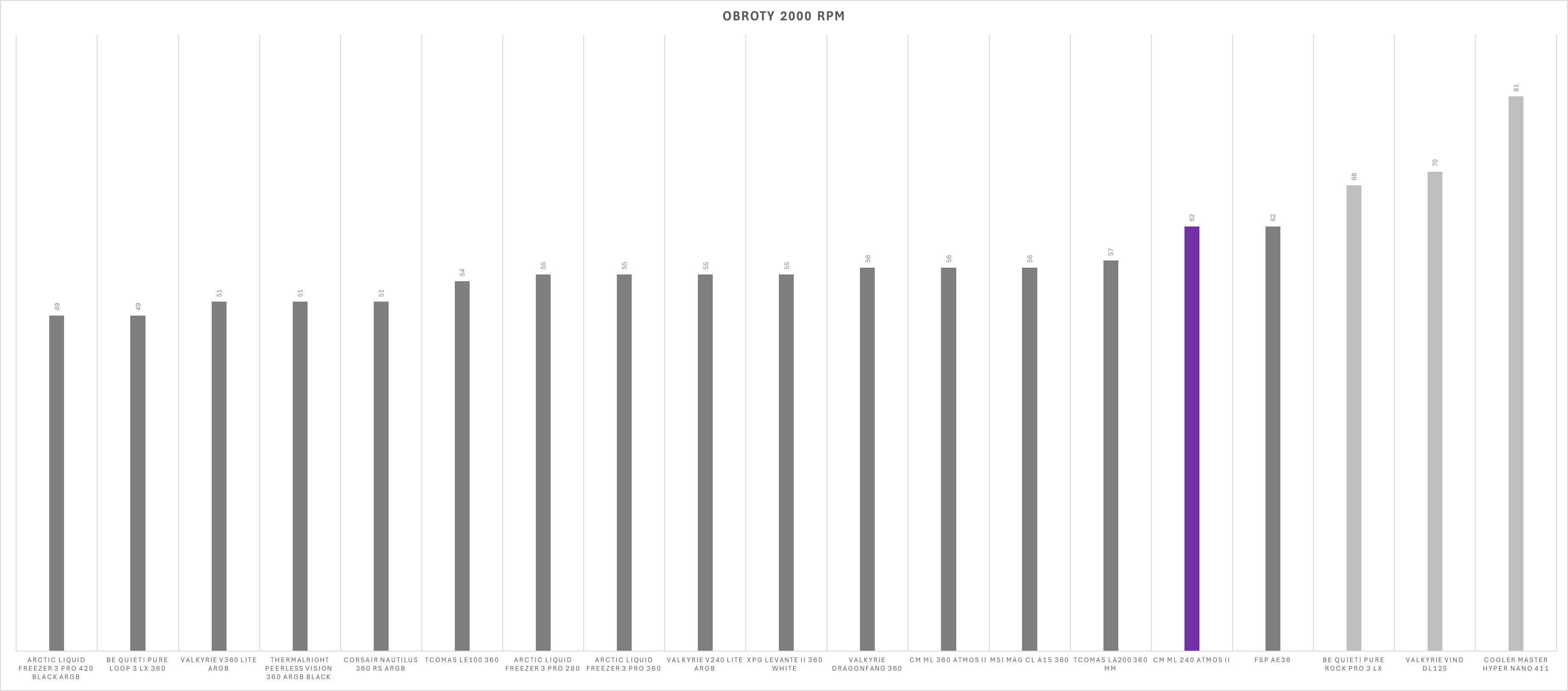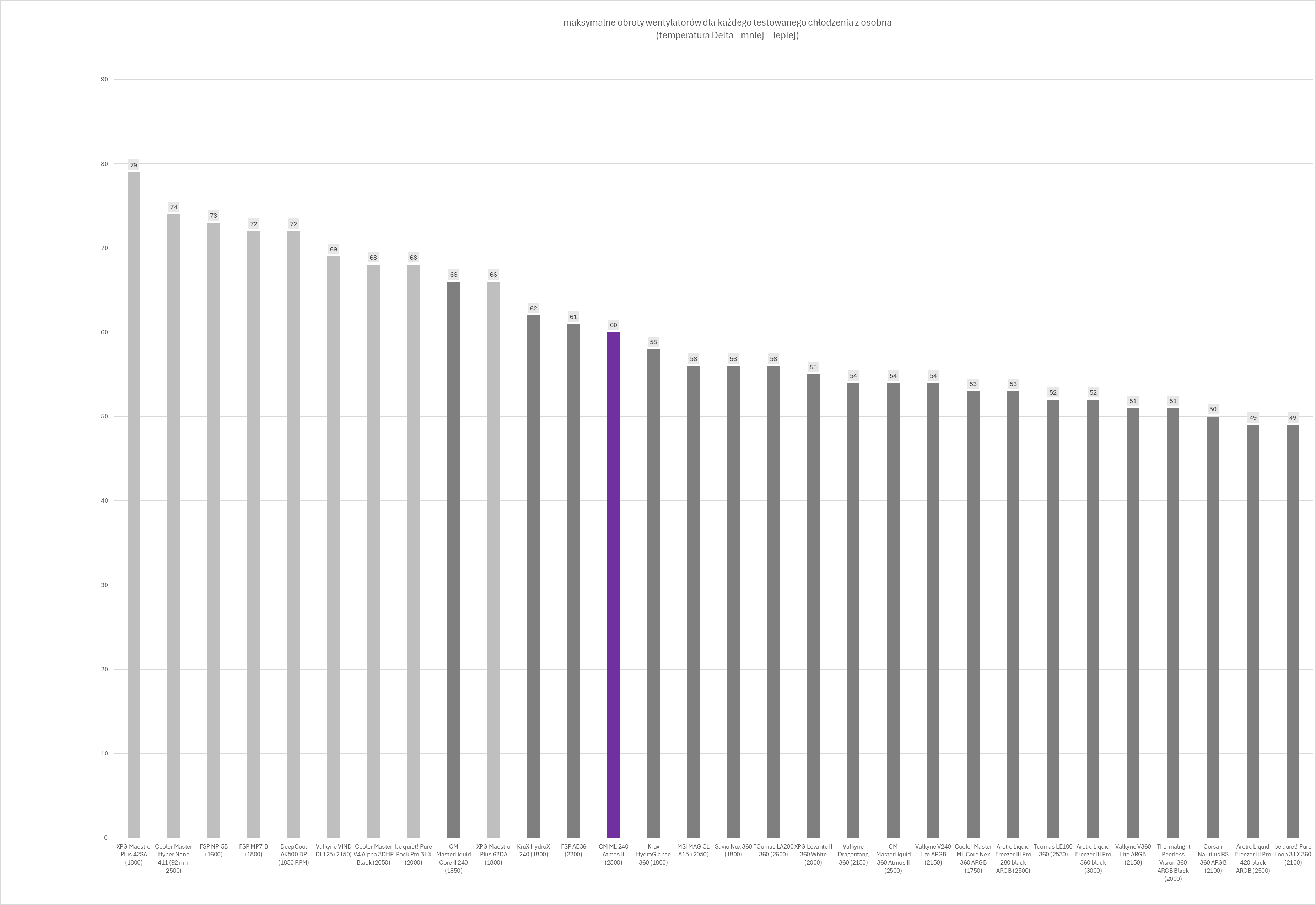 Jeśli spojrzeć na wyniki syntetycznie, Atmos II 240 lokuje się w górnej części wśród innych chłodzeń typu 240 mm Warto jednak zaznaczyć, że absolutna czołówka (360 / 420 mm) utrzymuje dużą przewagę, natomiast kolejne pozycje bardzo się do siebie zbliżają, tworząc wyraźnie spłaszczony segment wydajnościowy. W praktyce oznacza to, że różnice między wieloma modelami są niewielkie i często trudne do odczucia poza pomiarami.