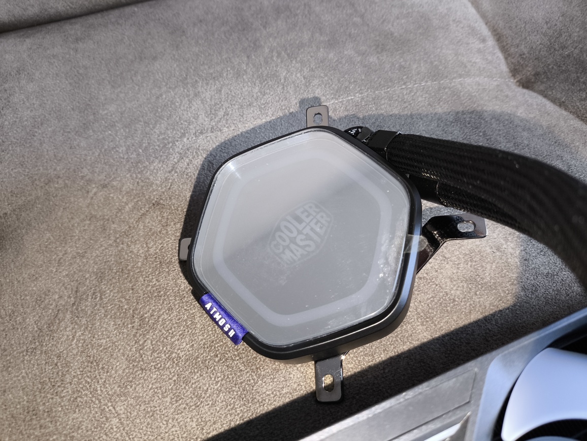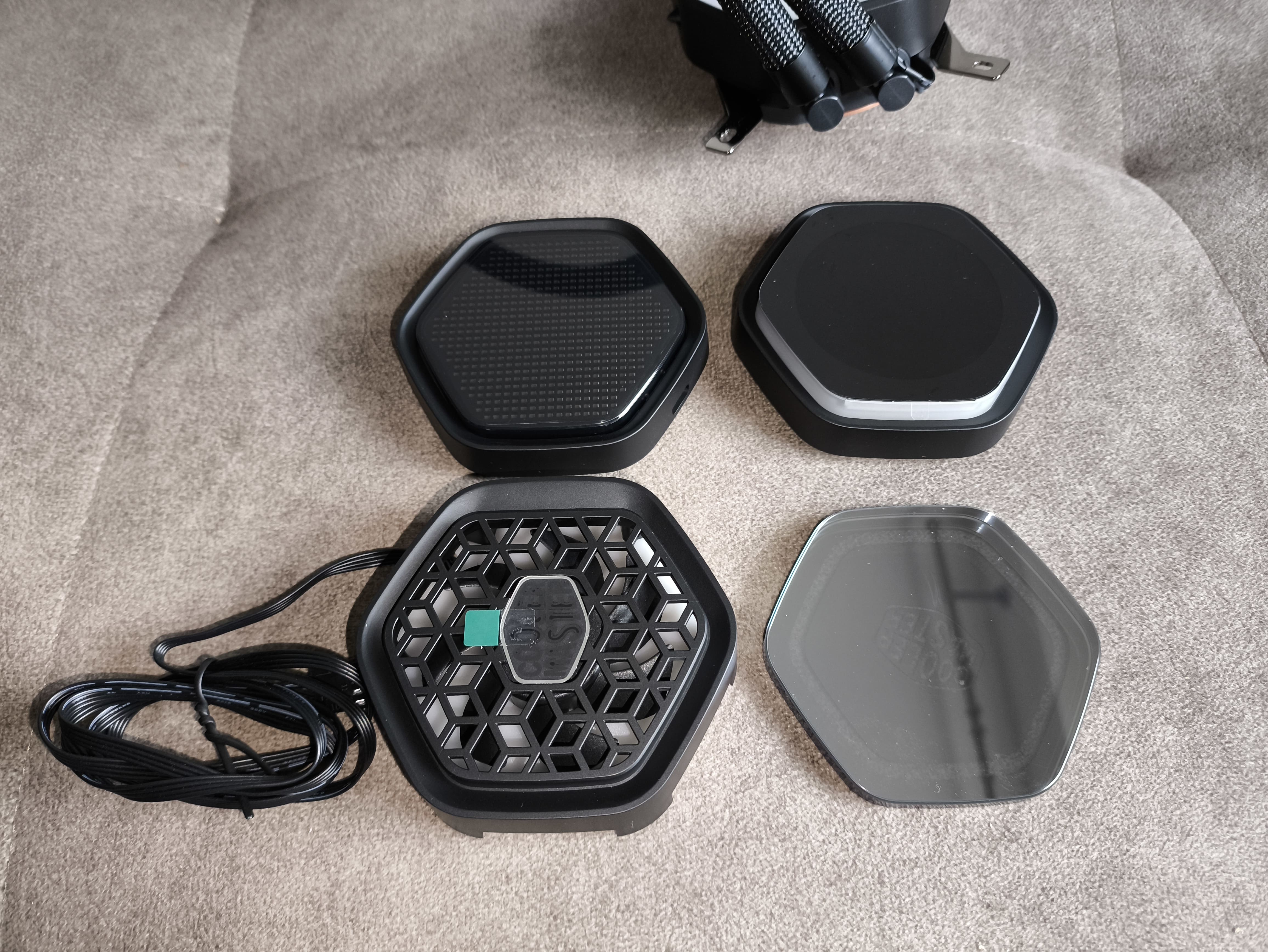 Jednym z najbardziej charakterystycznych elementów Cooler Master MasterLiquid 360 Atmos II są wymienne pokrywy blokopompki. Domyślnie zastosowana wersja typu „infinity mirror” oferuje efektowny, podświetlany pierścień otaczający logo producenta, które również zostało podświetlone.