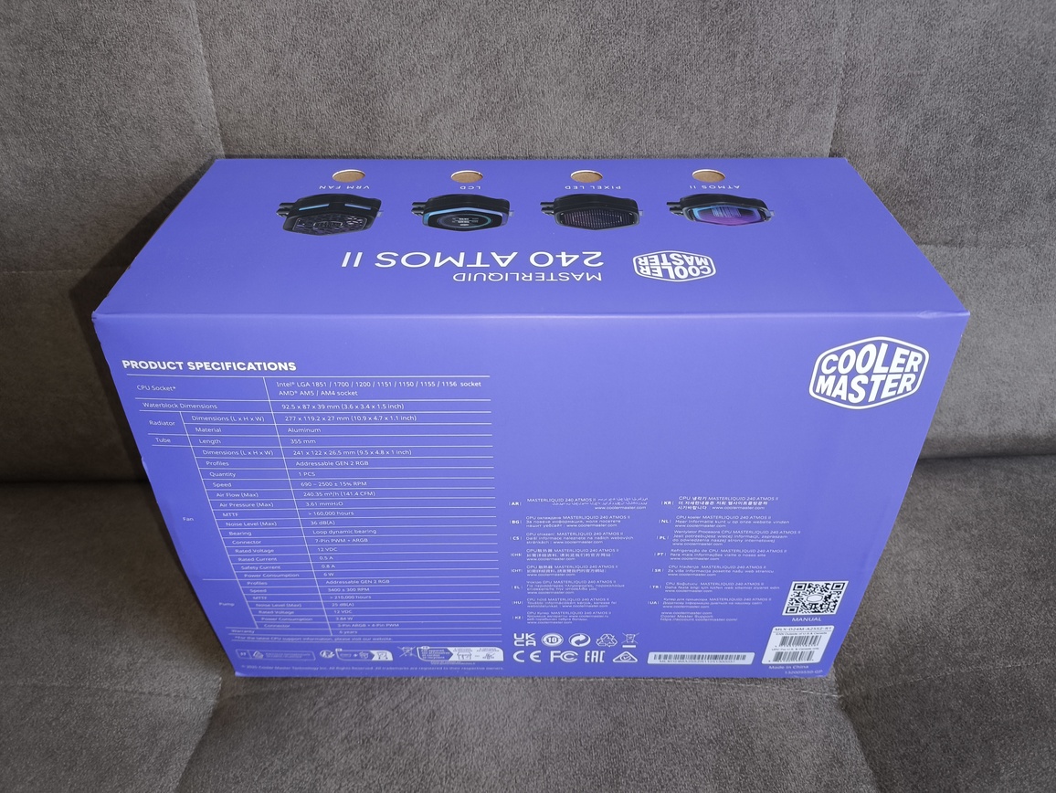 Cooler Master MasterLiquid Atmos II 240 dostarczany jest w opakowaniu utrzymanym w charakterystycznej dla producenta kolorystyce. Dominujący, przyjemny dla oka odcień fioletu stanowi tło dla zdjęcia chłodzenia z efektem lustrzanego odbicia na pokrywie blokopompki. W lewym górnym rogu umieszczono nazwę modelu, natomiast po przeciwnej stronie znajduje się logo Cooler Master.