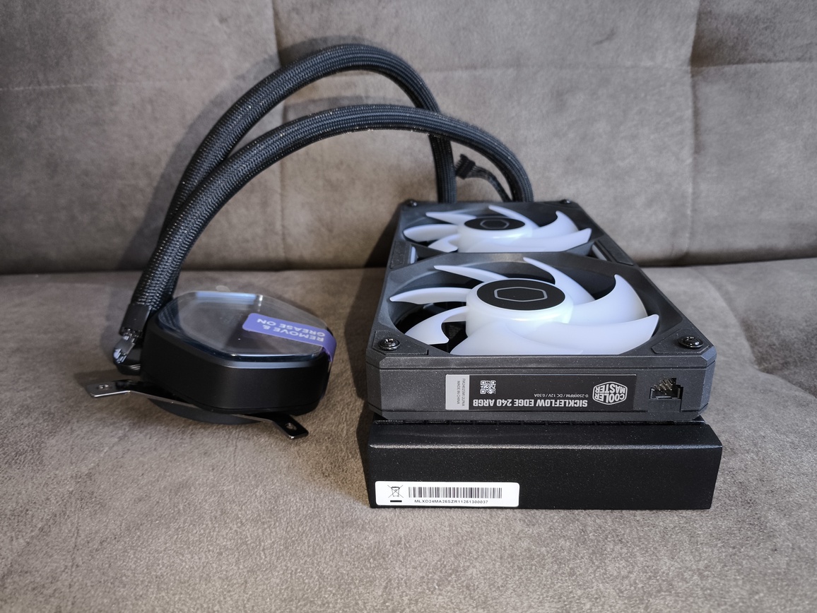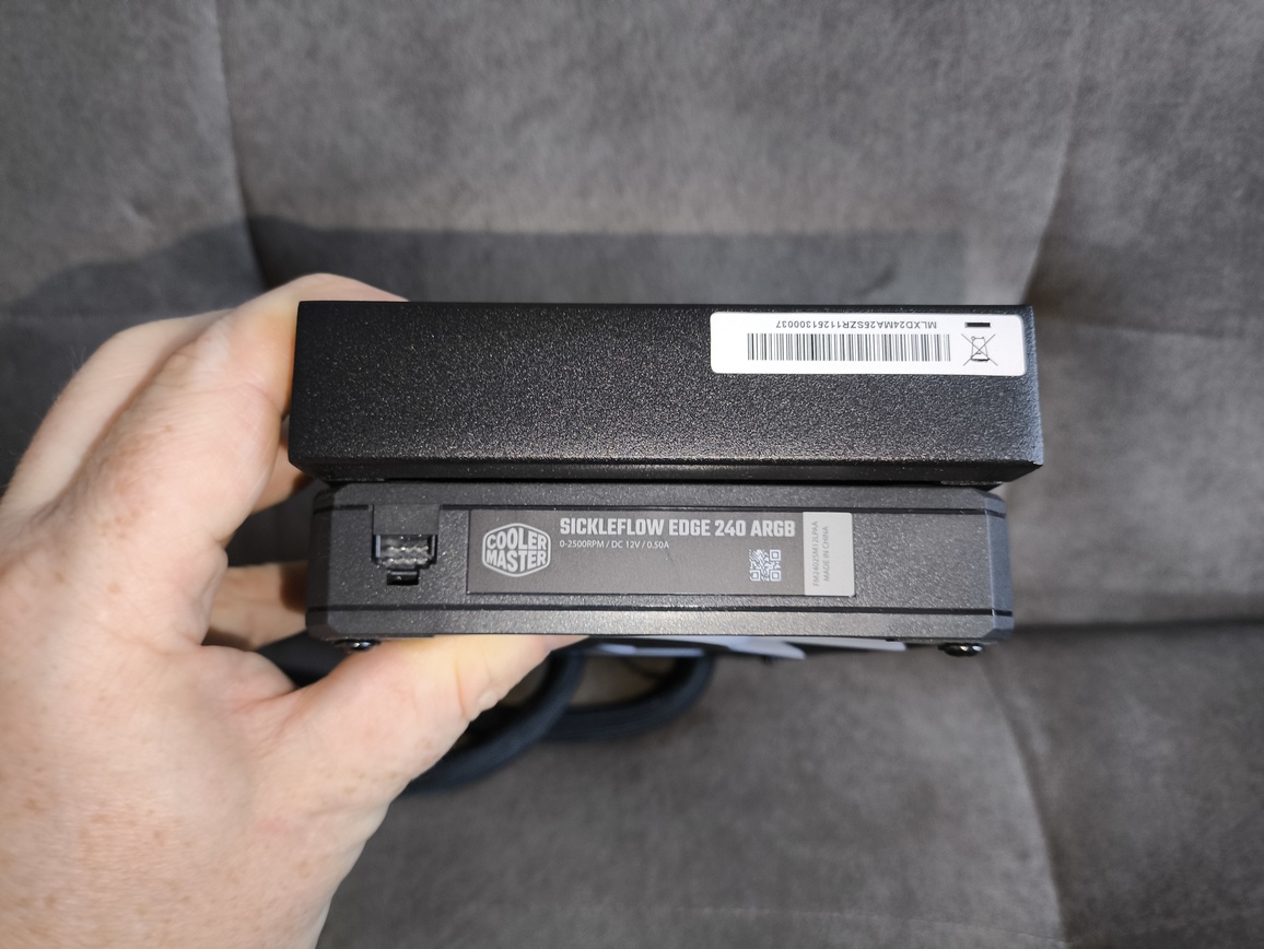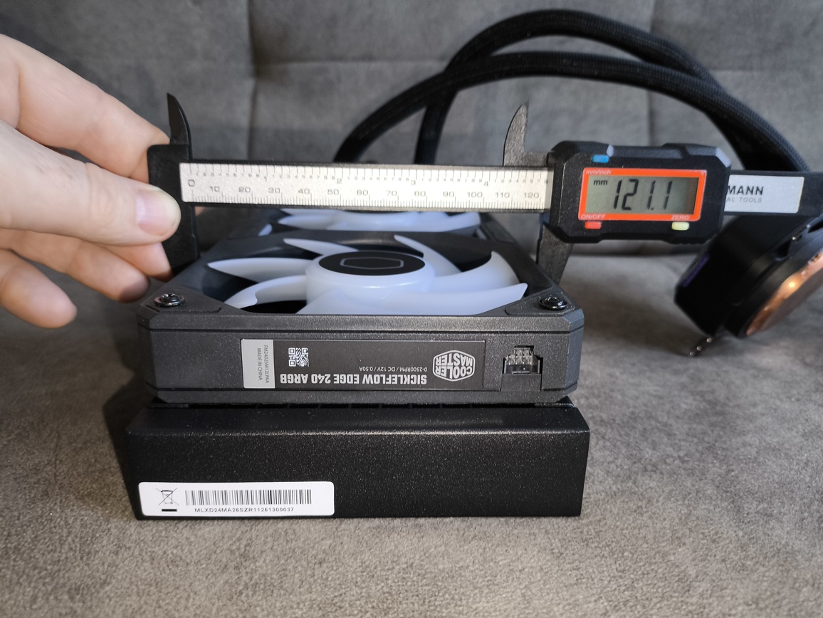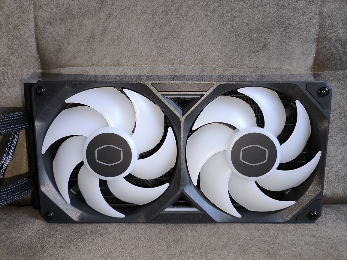 Testowany zestaw Cooler Master MasterLiquid Atmos II 240 korzysta z dwóch wentylatorów Cooler Master SickleFlow Edge 120 ARGB (241 x 122 x 26.5 mm), które w tej konfiguracji zostały połączone w jeden, spójny moduł montażowy.