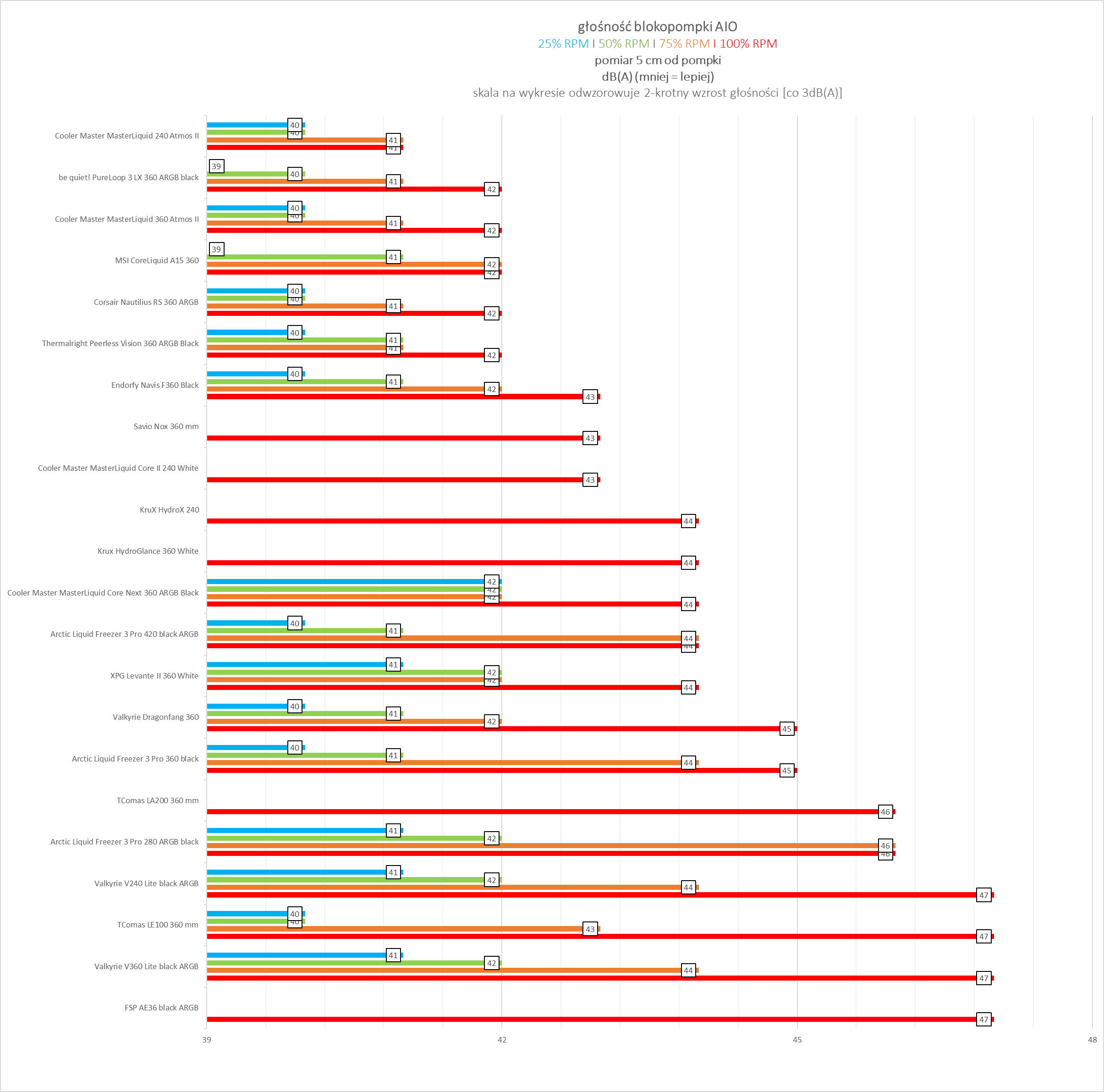 Na tym tle z kolei naprawdę bardzo dobrze wypada zastosowana blokopompka. Jej charakterystyka akustyczna stoi na wysokim poziomie – nawet przy 100% obrotów generowany hałas wynosi około 42 dB, co jest wynikiem ze ścisłej czołówki. W praktyce oznacza to poziom porównywalny z konstrukcjami takimi jak MSI CoreLiquid A15 360 czy Corsair Nautilus 360 RS ARGB.