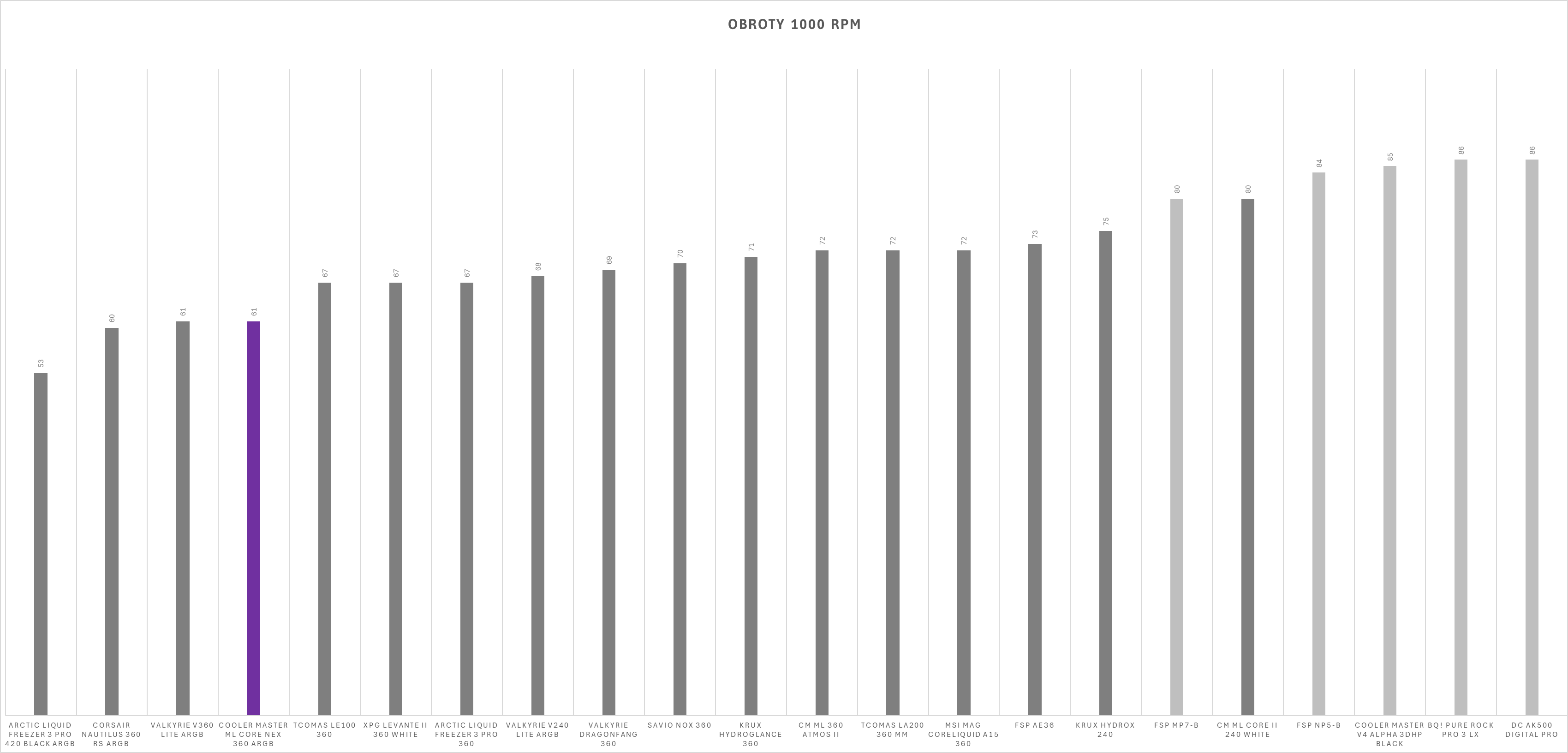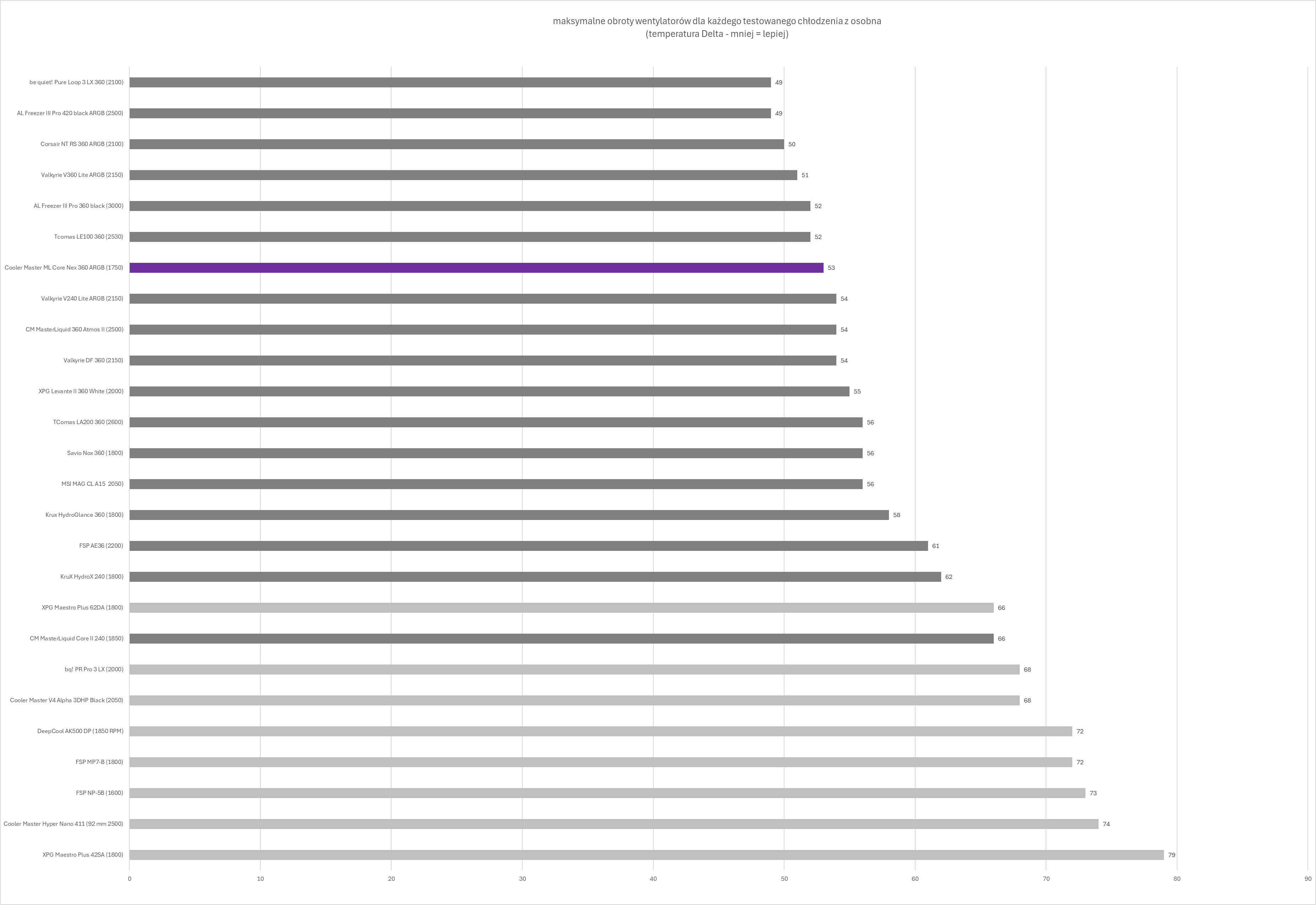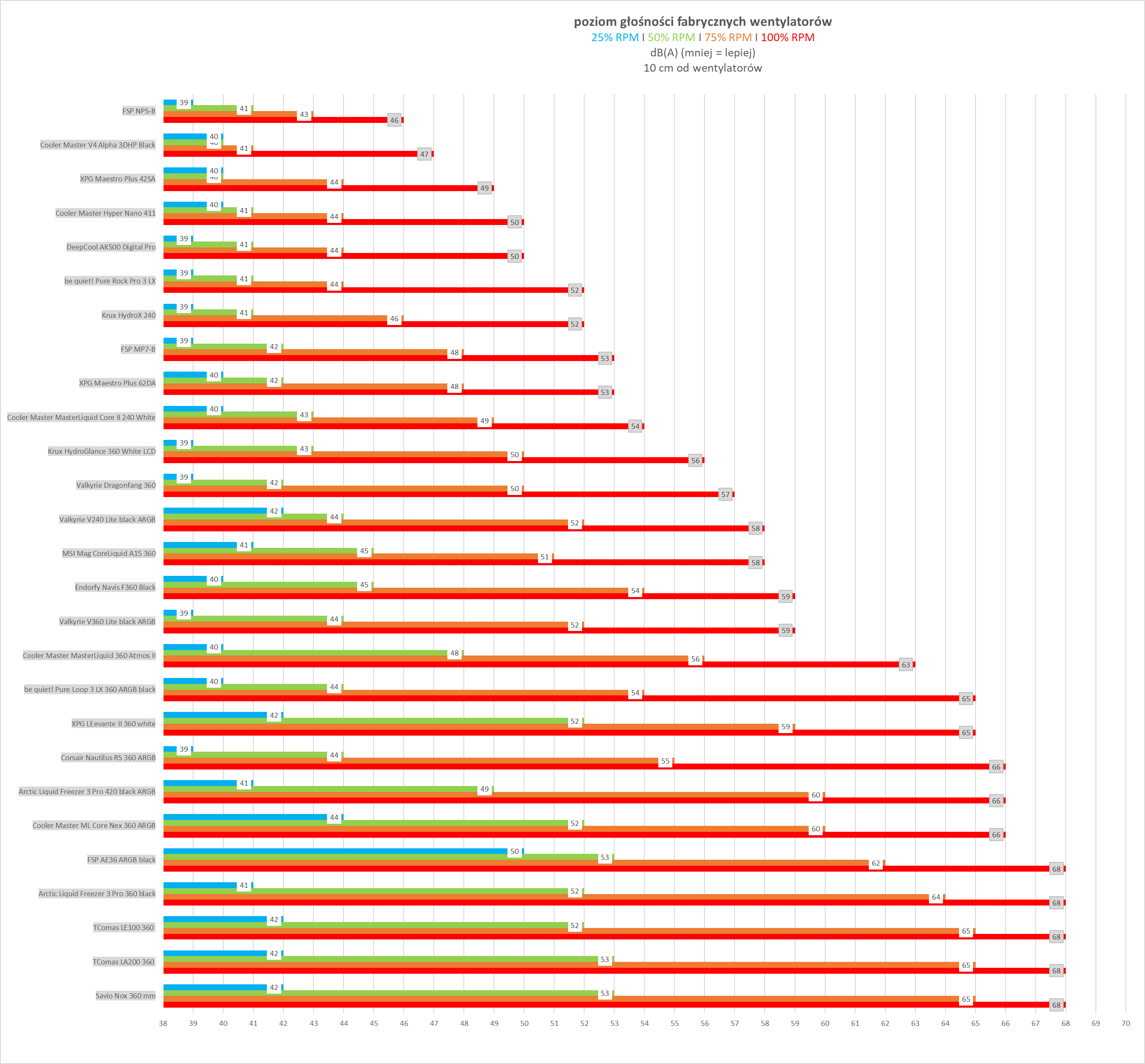 Ta wypada co najwyżej przeciętnie. Na najwyższych obrotach chłodzenie jest bardzo głośne. Przyzwoity poziom głośności jest osiągany dopiero przy skręceniu obrotów do 65% minimum. Ale odbywa się to kosztem temperatur niestety. Coś za coś niestety.
