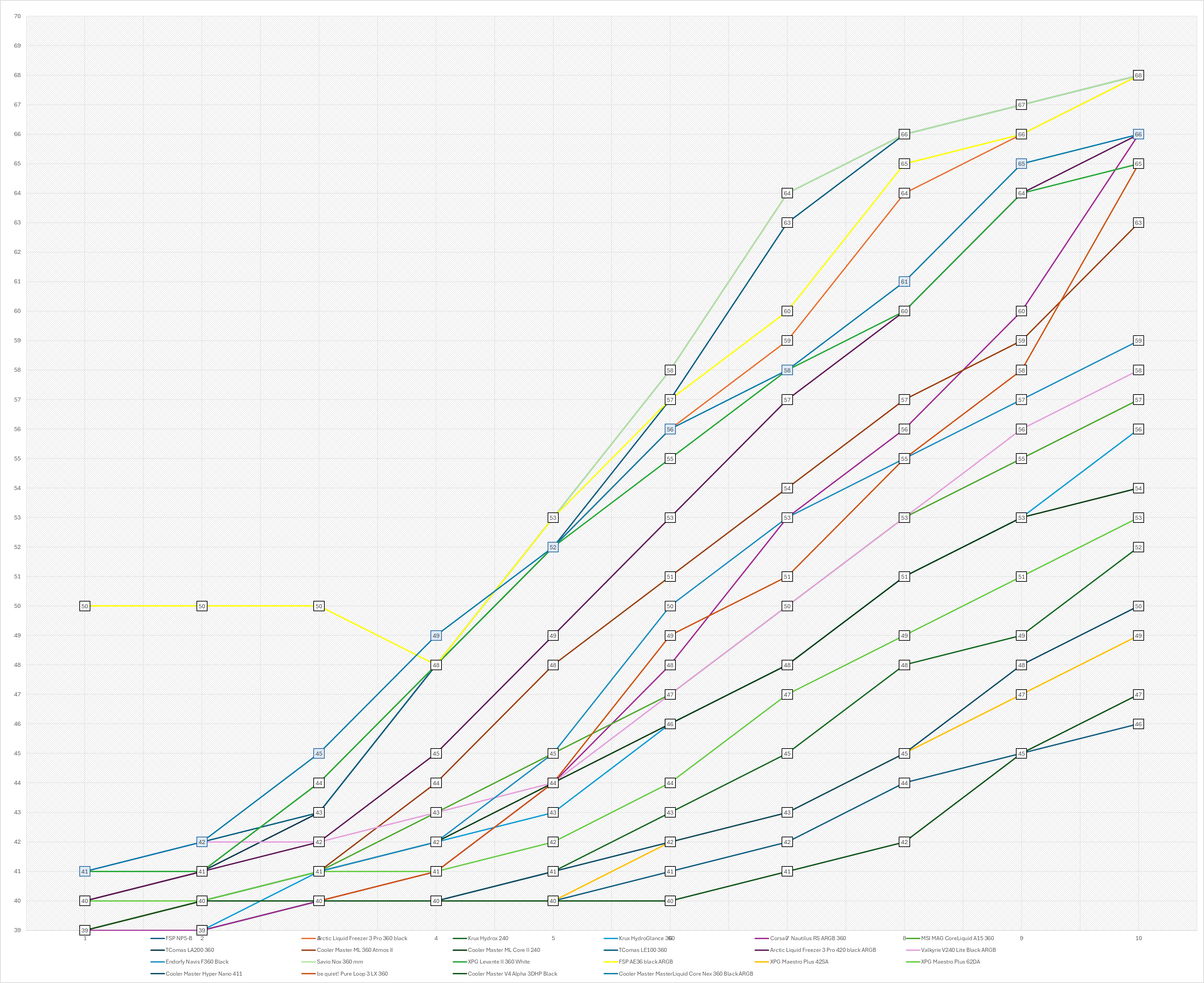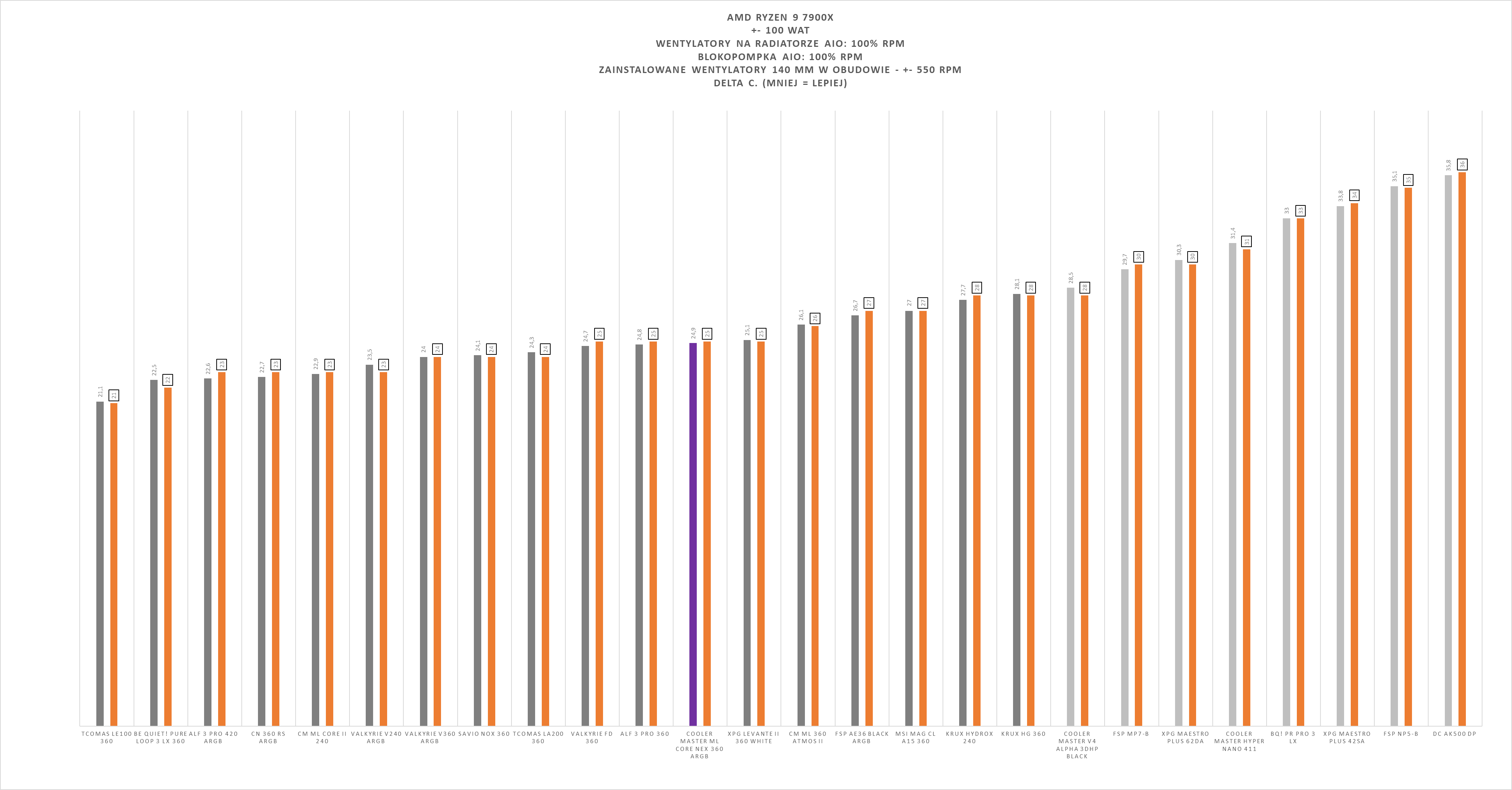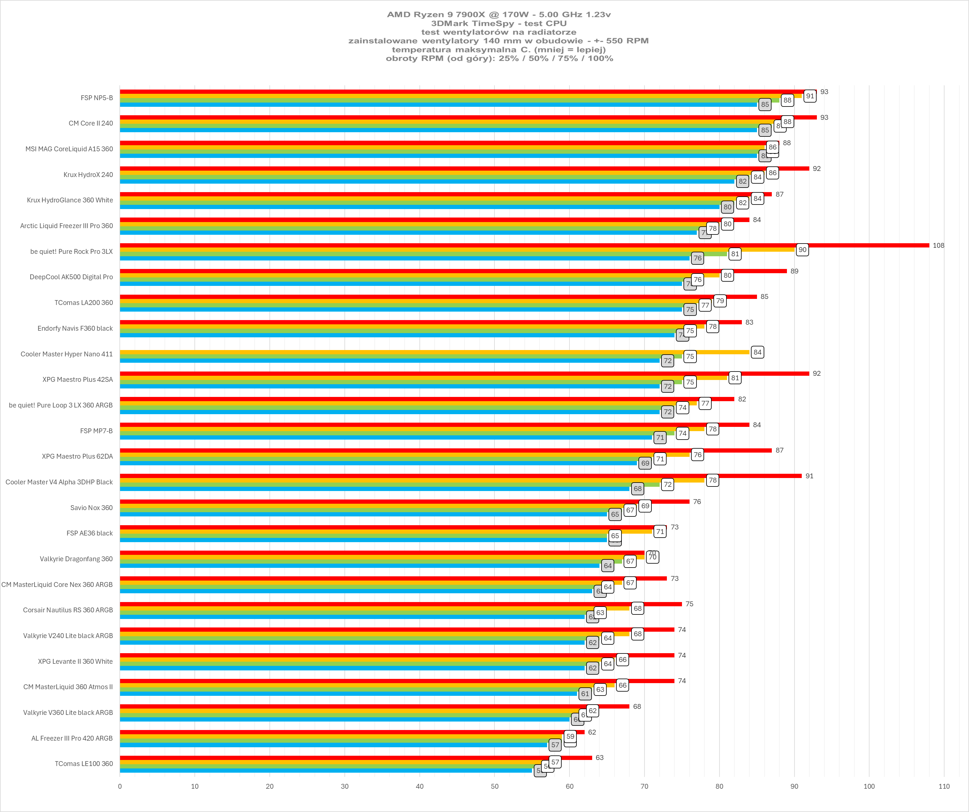 Wydajność ogólnie jest bardzo fajna zważywszy na cenę tego chłodzenia co już wstępnie pokazał benchmark w Prime95. W testach obrotów na różnych RPM chłodzenie zasadniczo wypada bardzo dobrze na tle rywali (w tle pamiętajmy o jego stosunkowo niskiej cenie zakupu). Gorzej jest przy testach z różnym RPM, aczkolwiek nadal jest to solidny poziom. Co więcej, chłodzenie spokojnie zdało test przy ustawionych 225 Watach na procesorze, a przecież nie każde chłodzenie temu podołało.