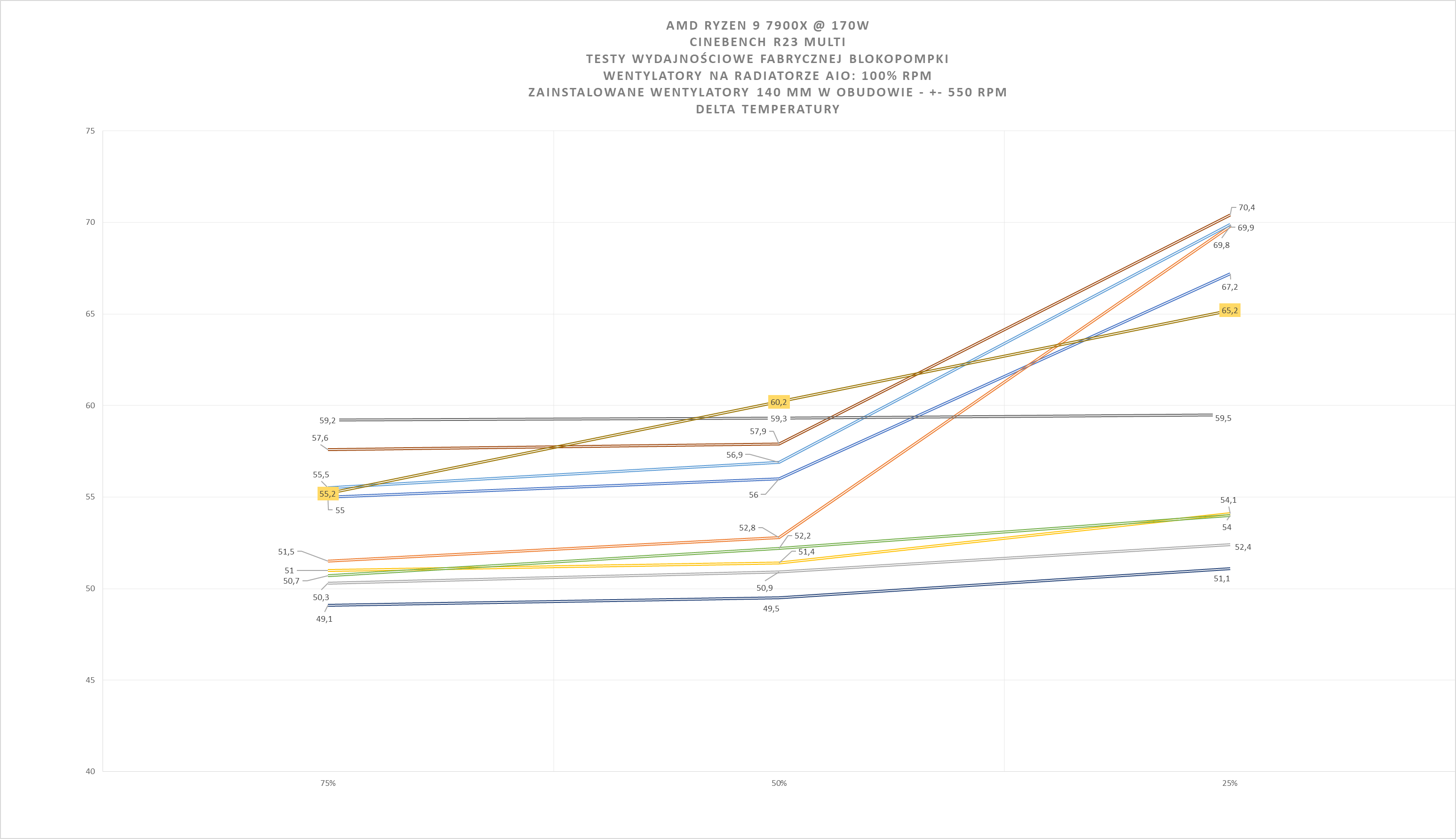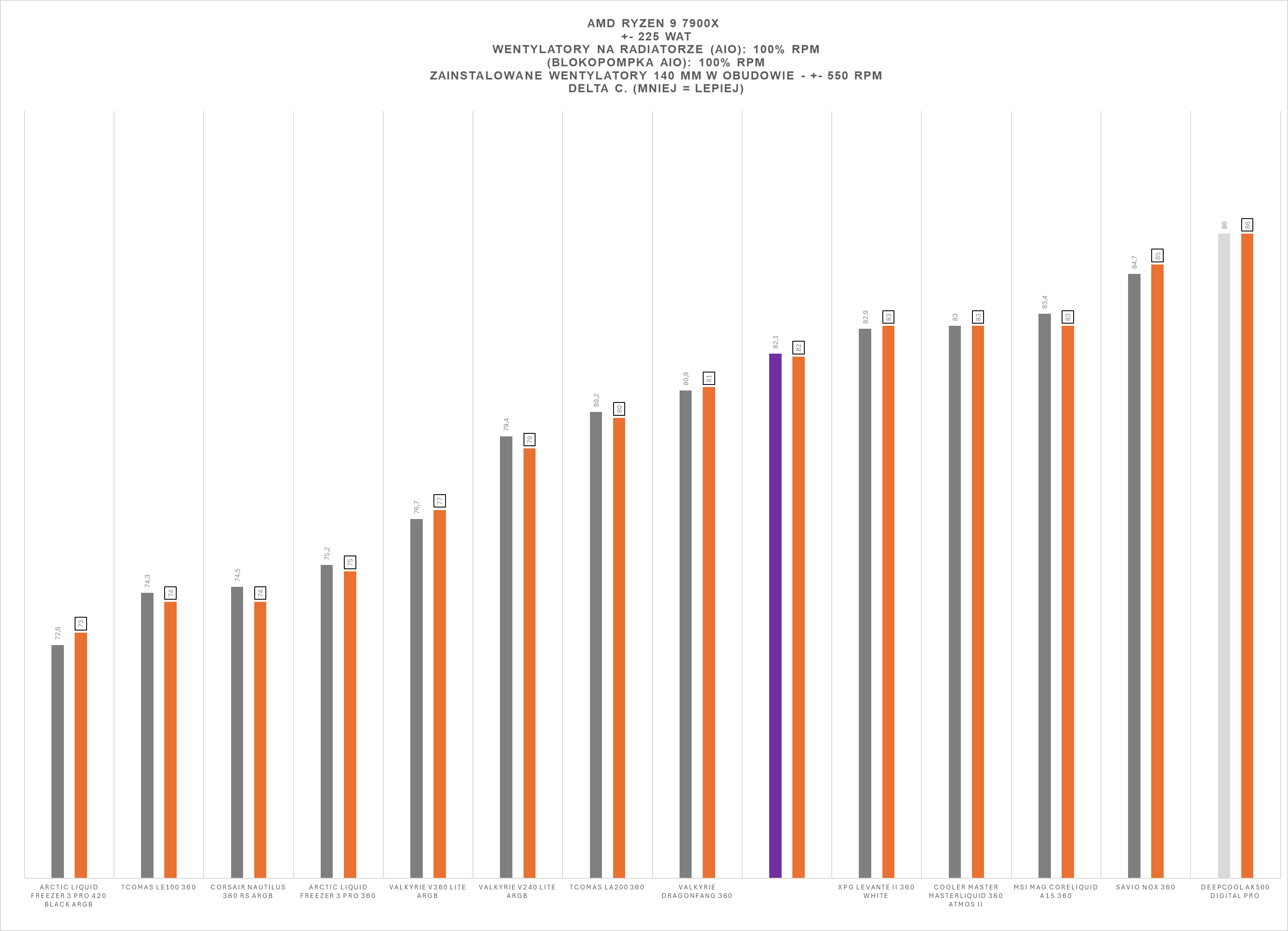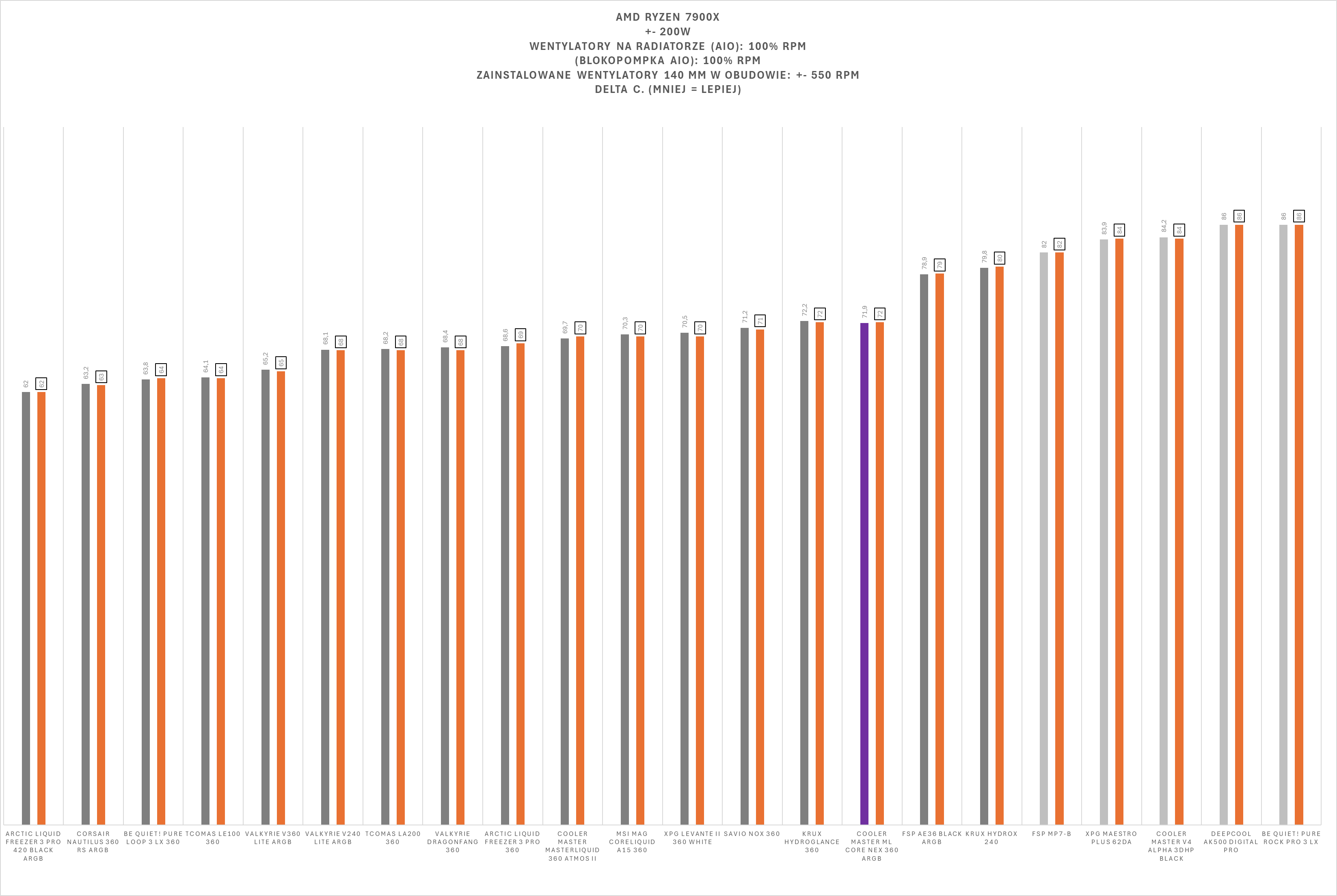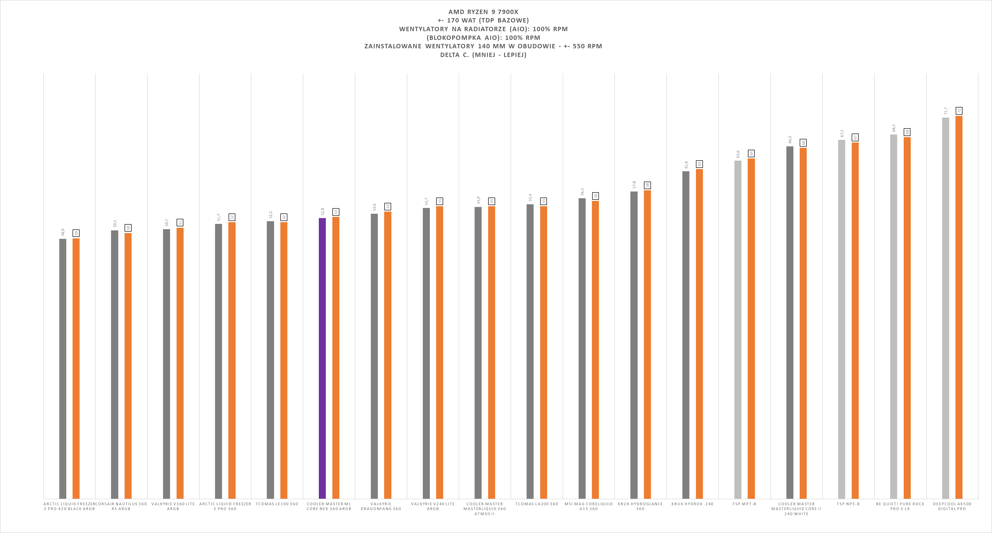 Wydajność ogólnie jest bardzo fajna zważywszy na cenę tego chłodzenia co już wstępnie pokazał benchmark w Prime95. W testach obrotów na różnych RPM chłodzenie zasadniczo wypada bardzo dobrze na tle rywali (w tle pamiętajmy o jego stosunkowo niskiej cenie zakupu). Gorzej jest przy testach z różnym RPM, aczkolwiek nadal jest to solidny poziom. Co więcej, chłodzenie spokojnie zdało test przy ustawionych 225 Watach na procesorze, a przecież nie każde chłodzenie temu podołało.
