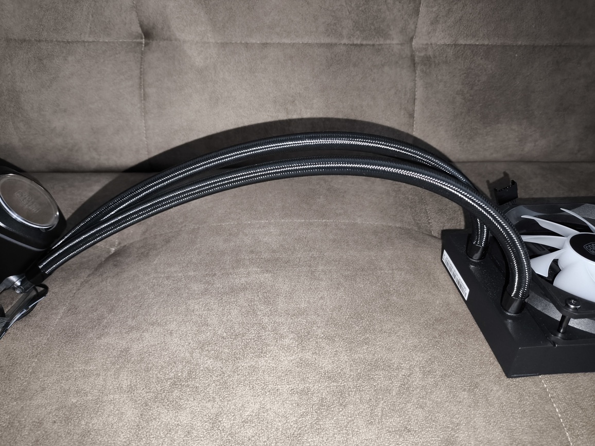 Węże o długości 400 mm są elastyczne i wystarczająco długie do montażu w większości obudów typu mid-tower i większych. Oplot jest estetyczny i sztywny w stopniu zapewniającym dobre prowadzenie bez efektu opadania. Są też odporne na zagięcia nawet przy ostrzejszych łukach, a ich końcówki przy bloku wodnym mają możliwość obrotu, co ułatwia manewrowanie. Dodatkowo możemy je, ale nie musimy, spiąć dwoma dołączonymi do zestawu plastikowymi klipsami.