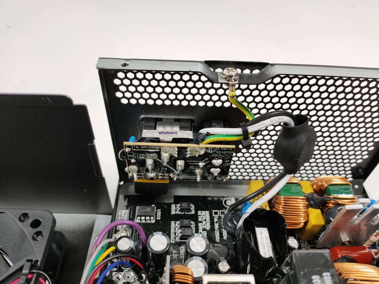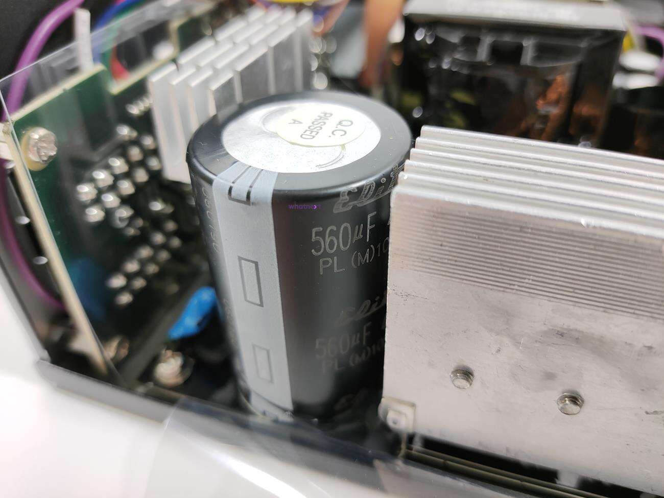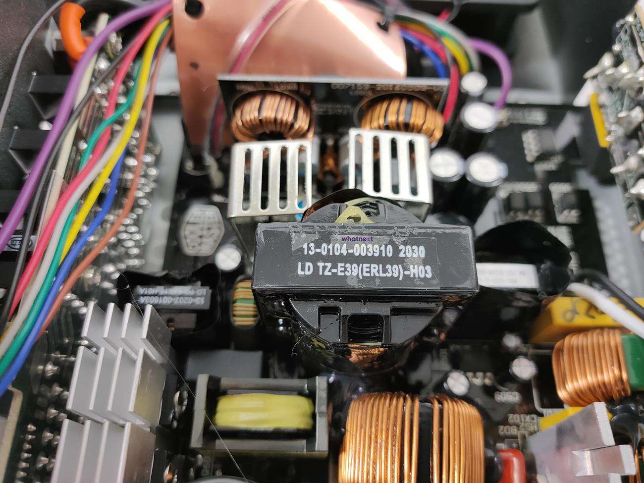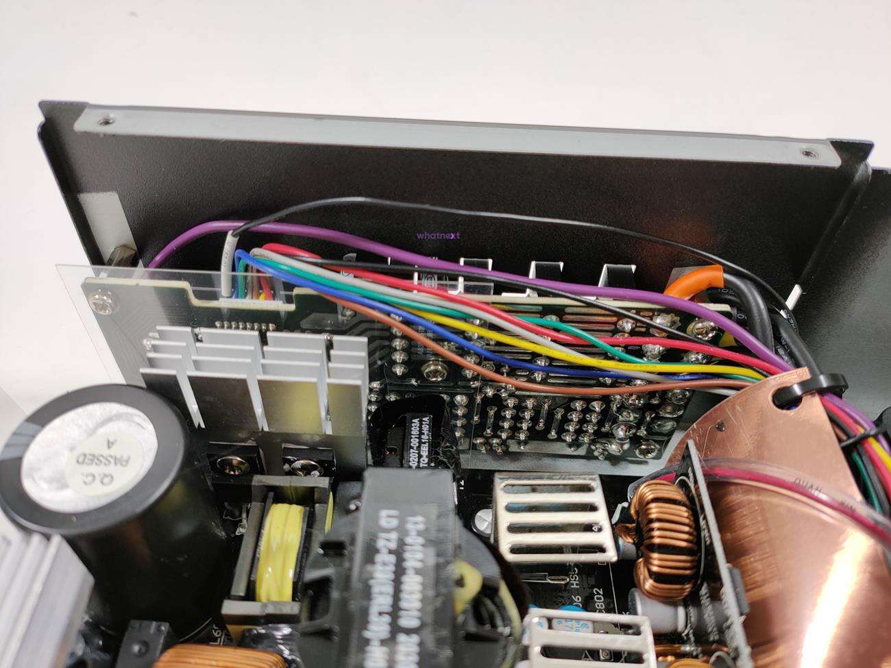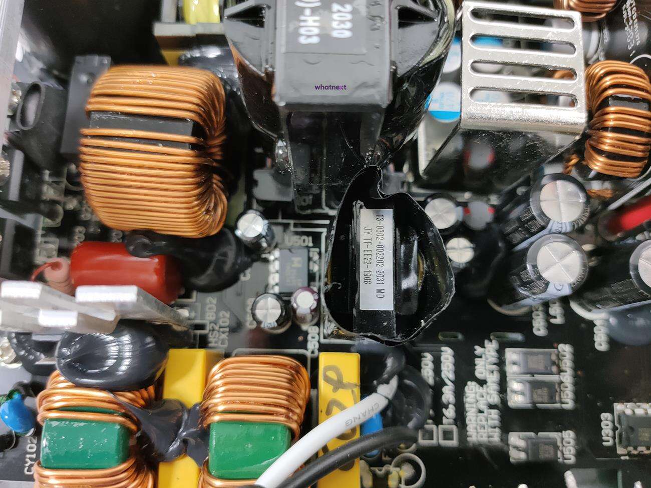 W środku możemy zobaczyć największy kondensator produkcji Elite o parametrach 400 V, 560 uF i temperaturze pracy do 105°C. Nie zabrakło też przetwornicy DC-DC czy aktywnego PFC. Zasilacz oferuje też następujące zabezpieczenia: zabezpieczenie nadnapięciowe (OVP), zabezpieczenie nadmocowe (OPP), zabezpieczenie przed nadmierną temperaturą (OTP), zabezpieczenie przed zwarciem (SCP), zabezpieczenie podnapięciowe (UVP), zabezpieczenie nadprądowe (OCP).