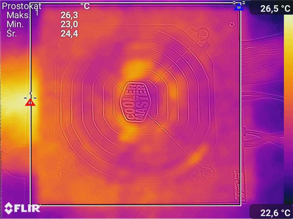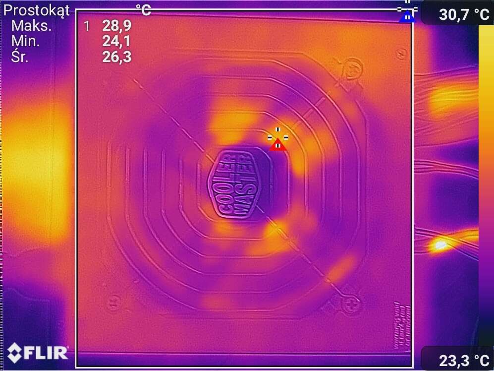 Spoczynek polegał tylko na wyświetlaniu pulpitu. Obciążenie to FurMark + Cinebench R23. W testach temperatury wykorzystałem moduł termowizyjny smartfonu CAT S61.