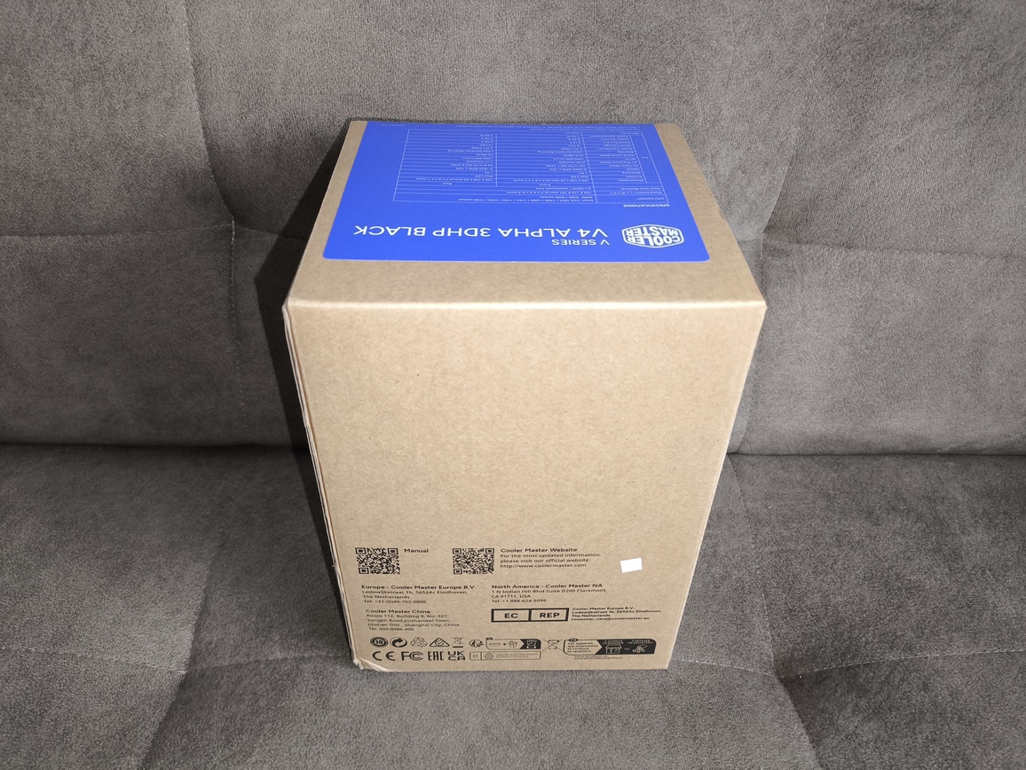 Cooler Master V4 Alpha 3DHP Black trafia do Nas w stosunkowo prostym, kartonowym opakowaniu, które jasno sugeruje, że producent postawił na optymalizację kosztów zamiast efektownej prezentacji. Zamiast sztywnego, lakierowanego pudełka z nadrukiem na całej powierzchni otrzymujemy klasyczny karton zabezpieczony dużą naklejką pełniącą jednocześnie funkcję plomby.